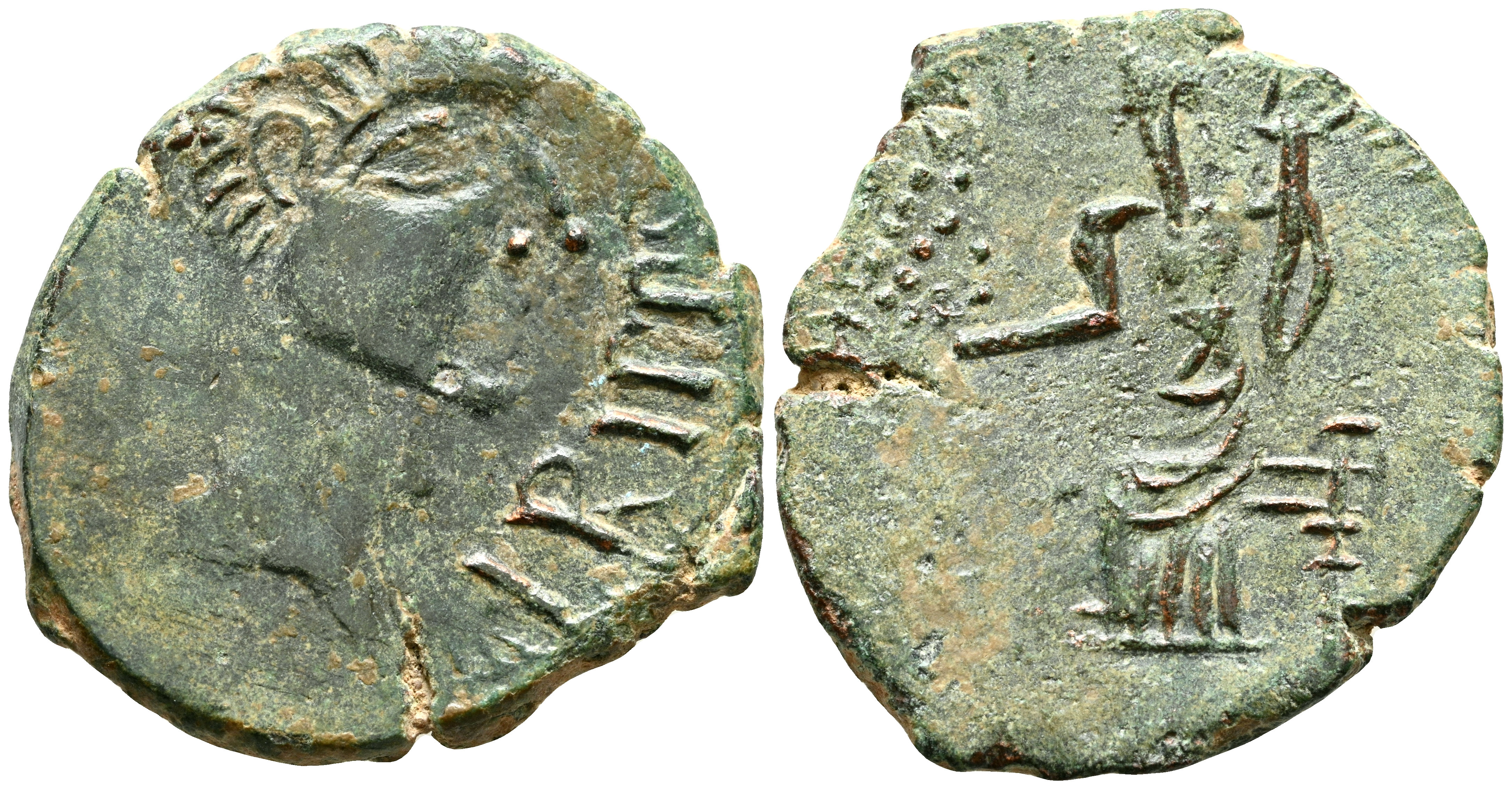 IRIPPO (Zona sur de Sevilla). Semis. (Ae. 4,87g/24mm). 30 d.C. (FAB-1581). Anv: Cabeza masculina a derecha, delante: IRIPPO. Rev: Figura femenina sentada a izquierda con piña y cornucopia. MBC.
