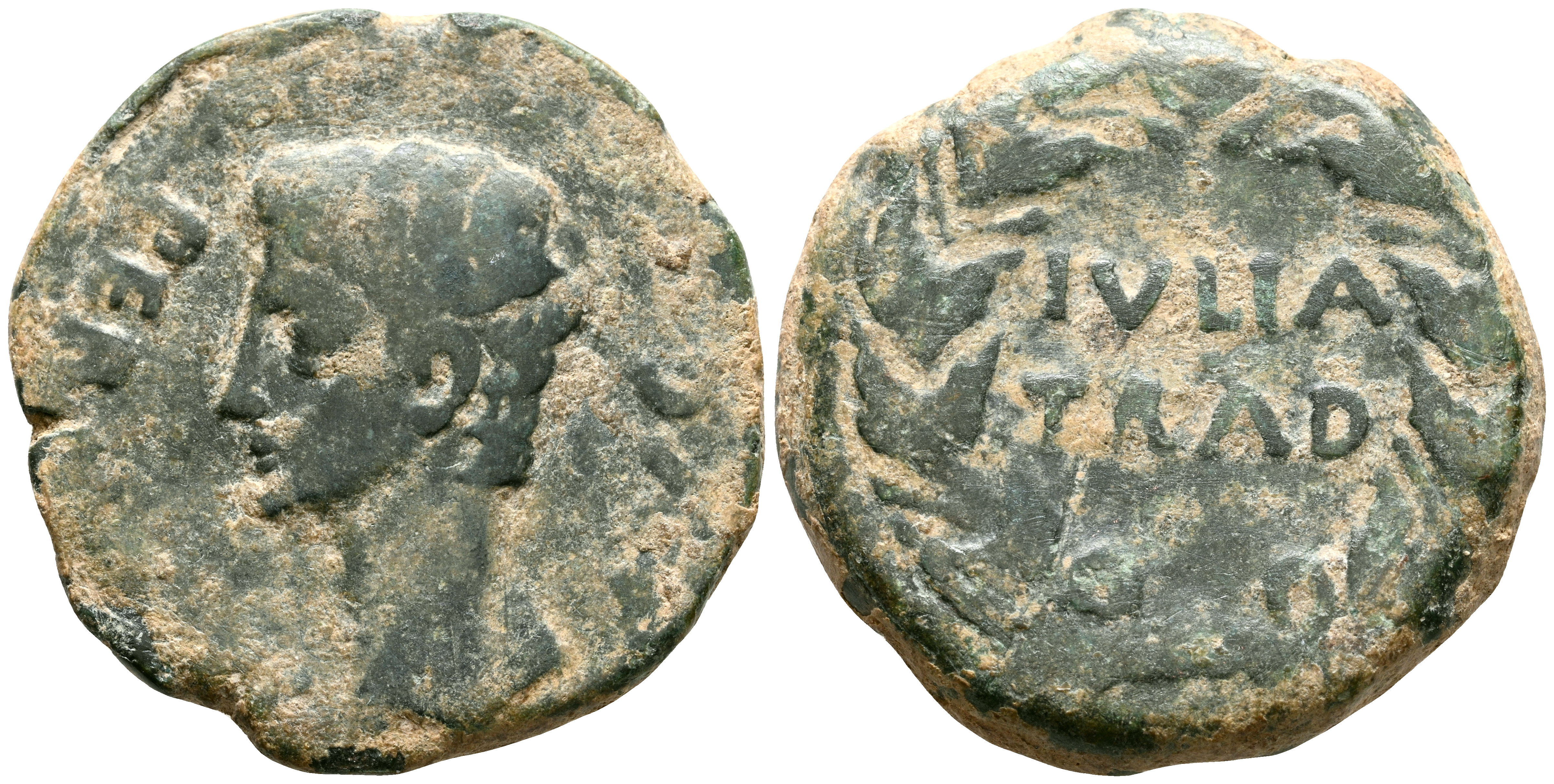 IULIA TRADUCTA (Algeciras, Cádiz). As. (Ae. 8,81g/25mm). 27 a.C.-14 d.C. (FAB-1614). Anv: Cabeza de Augusto a izquierda, alrededor leyenda: PERM CAES AVG. Rev: Leyenda: IVLIA/TRAD, dentro de corona de laurel. MBC-.
