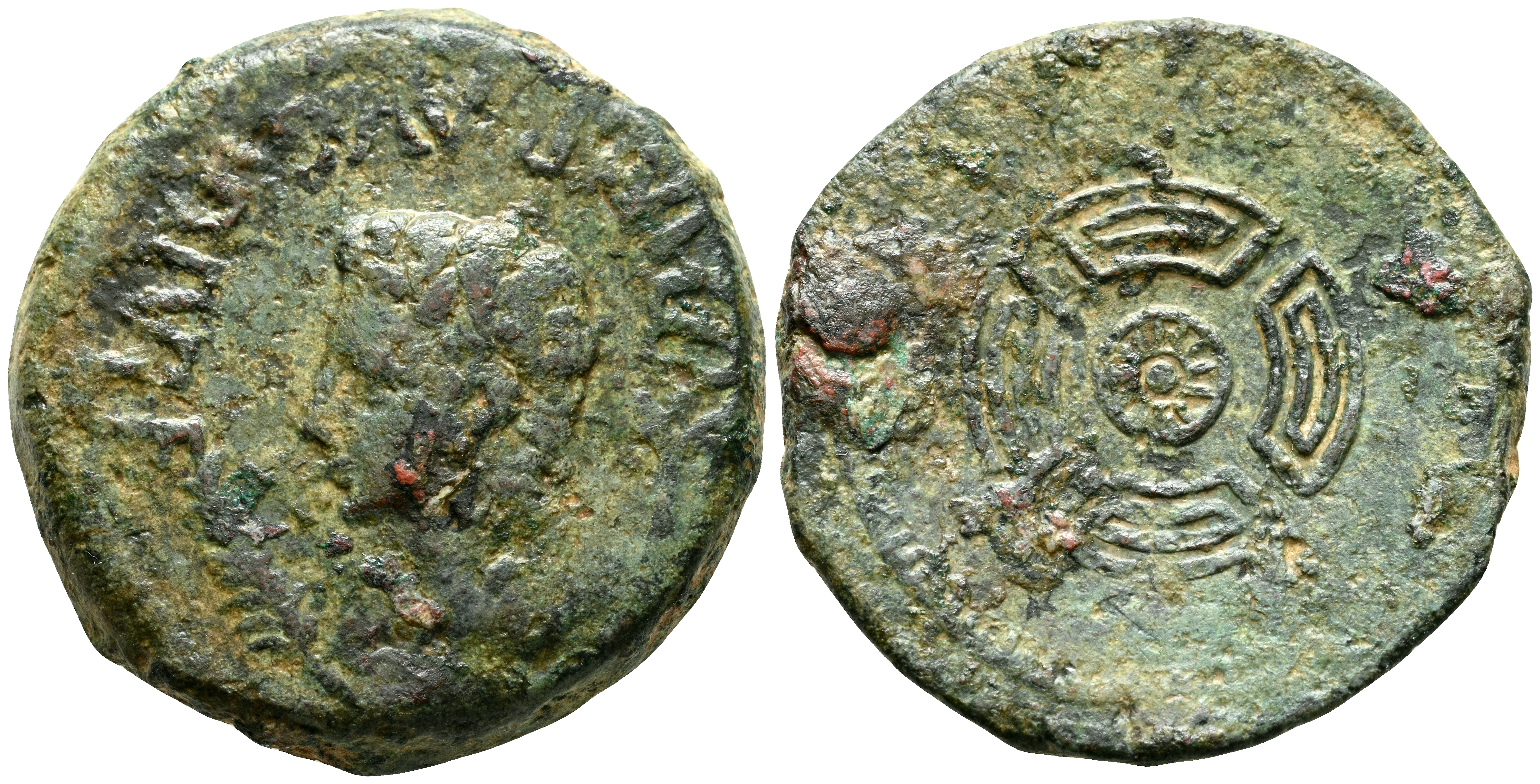 LUCO AUGUSTI (Lugo). As. (Ae. 10,19g/25mm). 27 a.C.-14 d.C. (FAB-1705). Anv: Cabeza de Augusto a izquierda, entre espiga y caduceo, encima leyenda: IMP AVG DIVI F. Rev: Rodela de frente con borde. MBC. Escaso ejemplar.