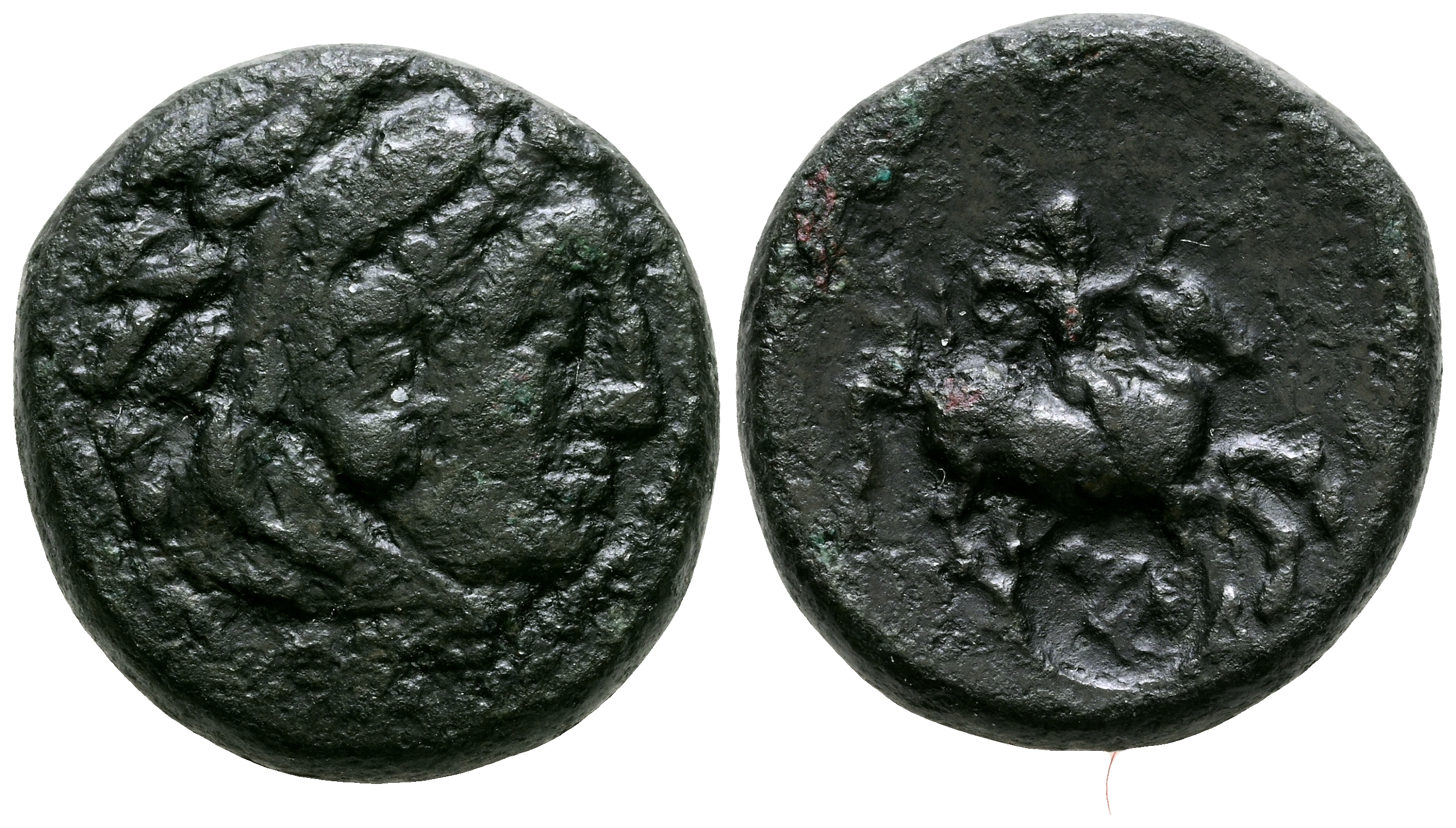 REYES DE MACEDONIA, Filipo III Arrideo. Ae19. (Ae. 3,32g/14mm). 323-317 a.C. Ceca incierta. (Price P2). Anv: Cabeza de heracles con piel de león a derecha. Rev: Jinete sobre caballo a derecha, detrás y debajo monogramas. MBC. Contramarca en reverso.