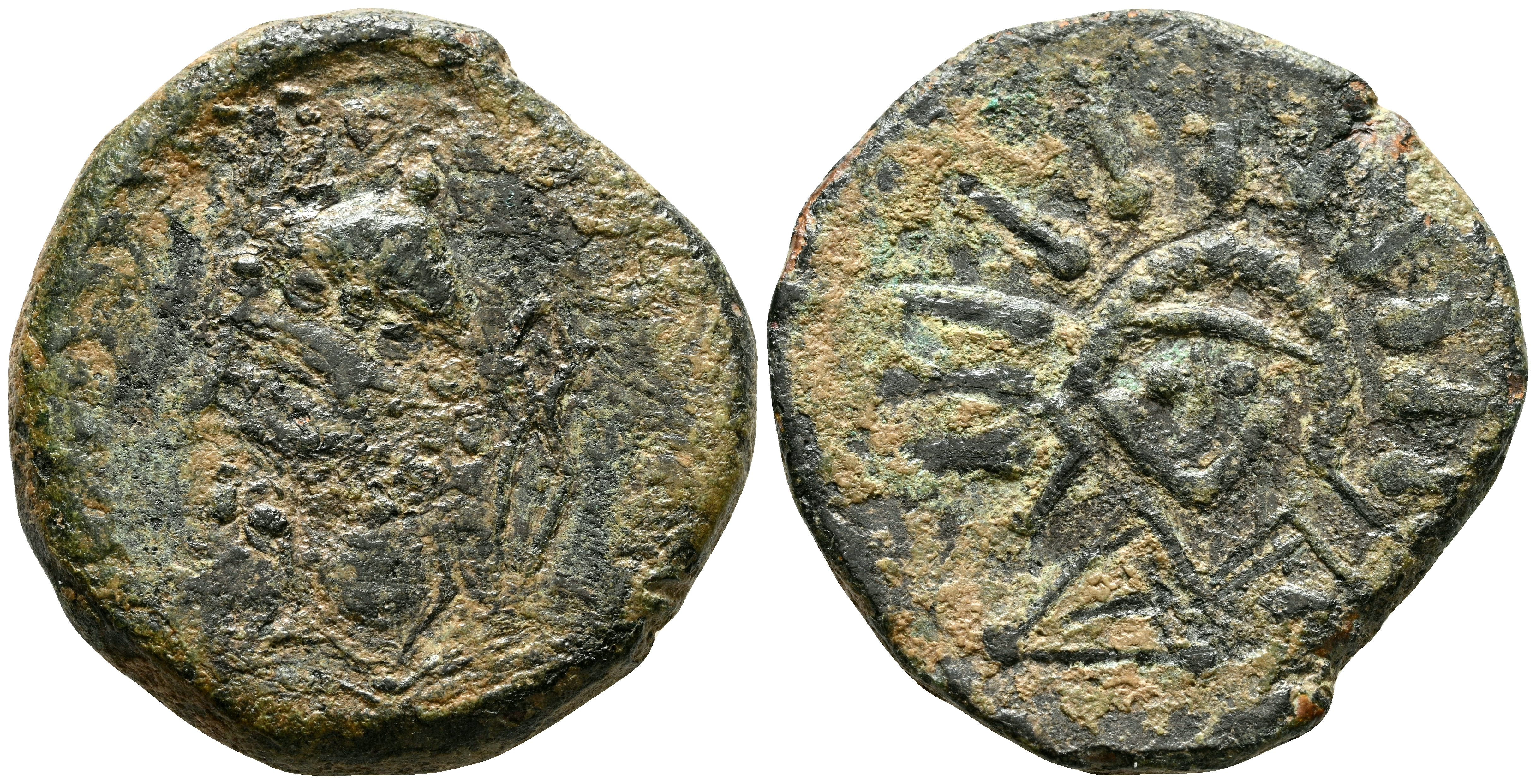 MALACA (Málaga). As. (Ae. 9,81g/25mm). 200-20 a.C. (FAB-1729). nv: Cabeza de Vulcano a izquierda, delante tenazas, detrás leyenda púnica tipo A. Rev: Cabeza de Helios de frente. BC+/MBC-.