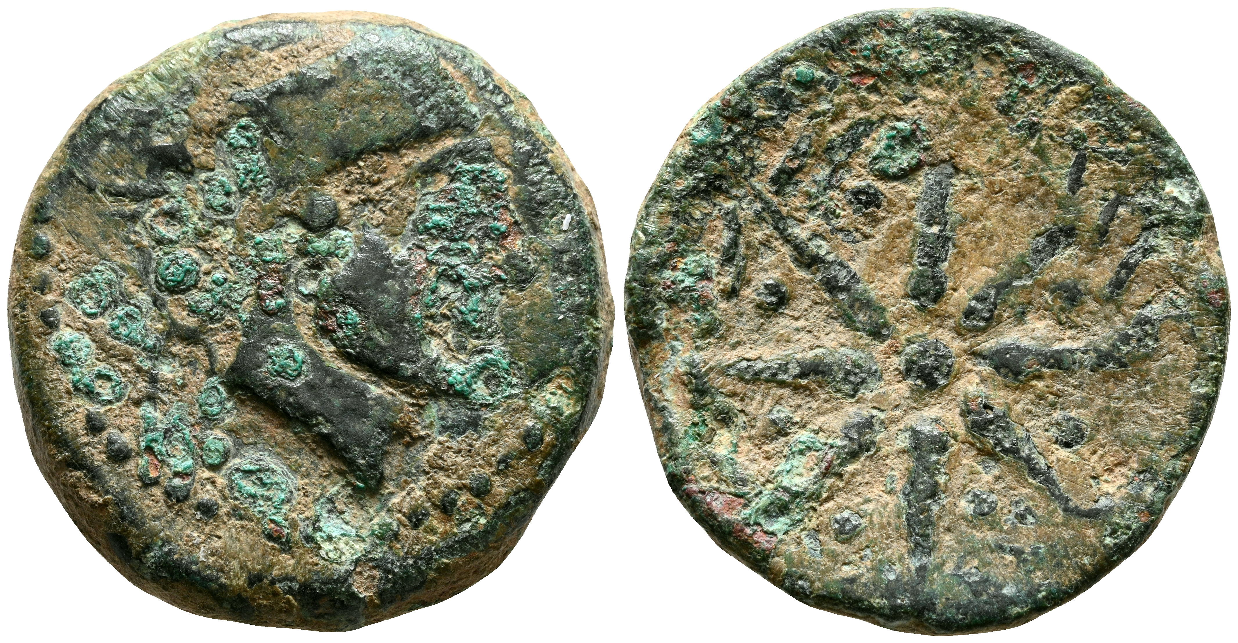 MALACA (Málaga). Semis. (Ae. 7,47g/22mm). 200-20 a.C. (FAB-1733, variante con puntos entre los rayos). Anv: Cabeza de Vulcano a la derecha, detrás de la leyenda púnica y las tenazas. Rev: Estrella dentro de corona de laurel. MBC-. Concreciones.