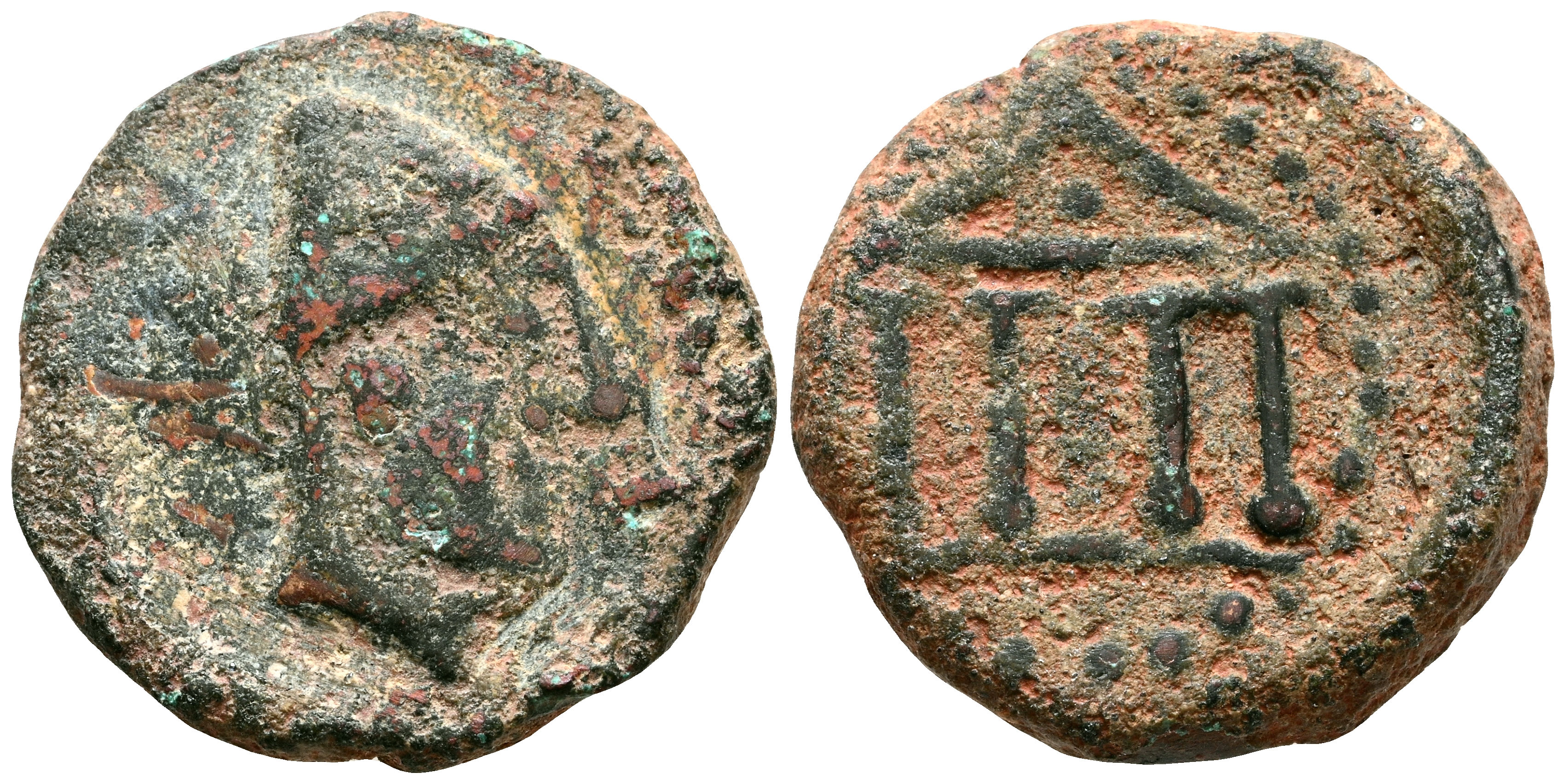 MALACA (Málaga). Cuadrante. (Ae. 4,44g/17mm). 200-20 A.C. (FAB-1737). Anv: Cabeza de Vulcano a derecha, delante tenazas, detrás leyenda púnica tipo B. Rev: Tempo tetrástilo. MBC.