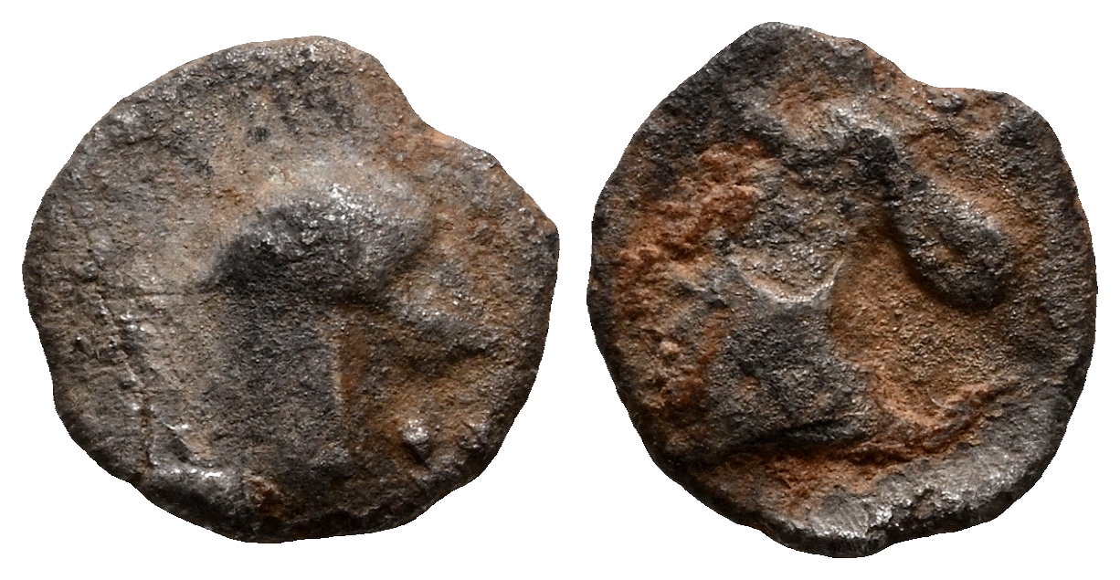 ARSE-SAGUNTO (Sagunto, Valencia). Hemióbolo. (Ar. 0,18g/6mm). 300-200 a.C. (FAB-2042). Anv: Cabeza galeada a derecha. Rev: Cabeza de caballo a derecha, alrededor leyenda ibérica. BC-/BC.