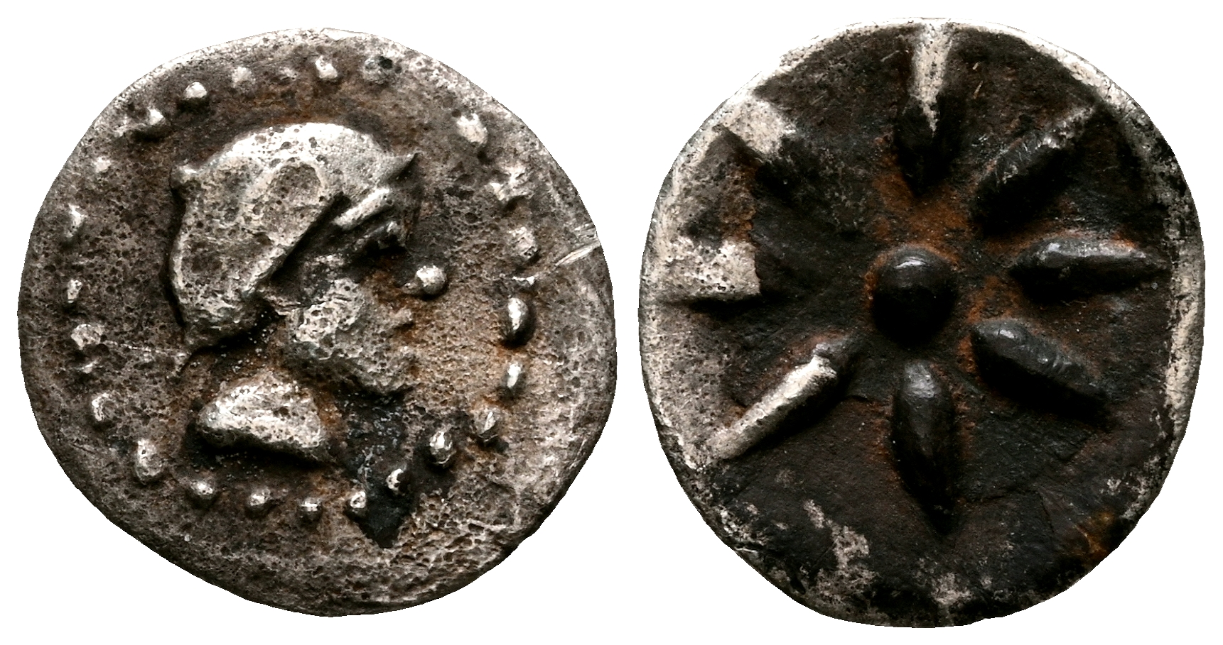 ARSE-SAGUNTO (Sagunto, Valencia). Hemióbolo. (Ar. 0,28g/9mm). Siglo III a.C. (FAB no cita; ACIP 1945). Anv: Cabeza femenina con sobrero redondo a derecha dentro de gráfila de puntos. Rev: Estrella de 8 puntas. MBC+.