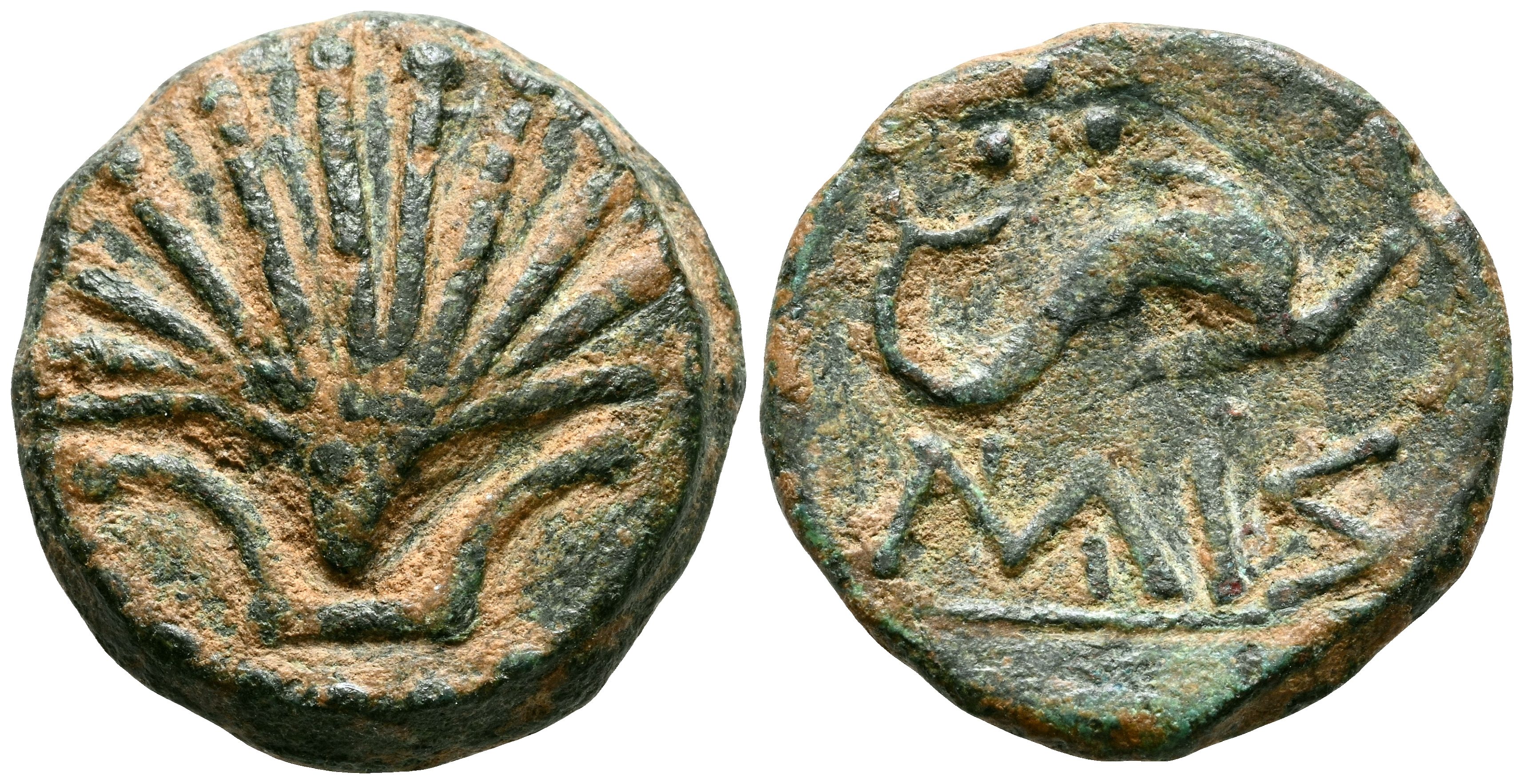 ARSE-SAGUNTO (Sagunto, Valencia). Cuadrante. (Ae. 4,63g/17mm). 170-20 a.C. (FAB-2051). Anv: Concha. Rev: Delfín, encima tres puntos, debajo leyenda ibérica: AIUBaS. MBC.