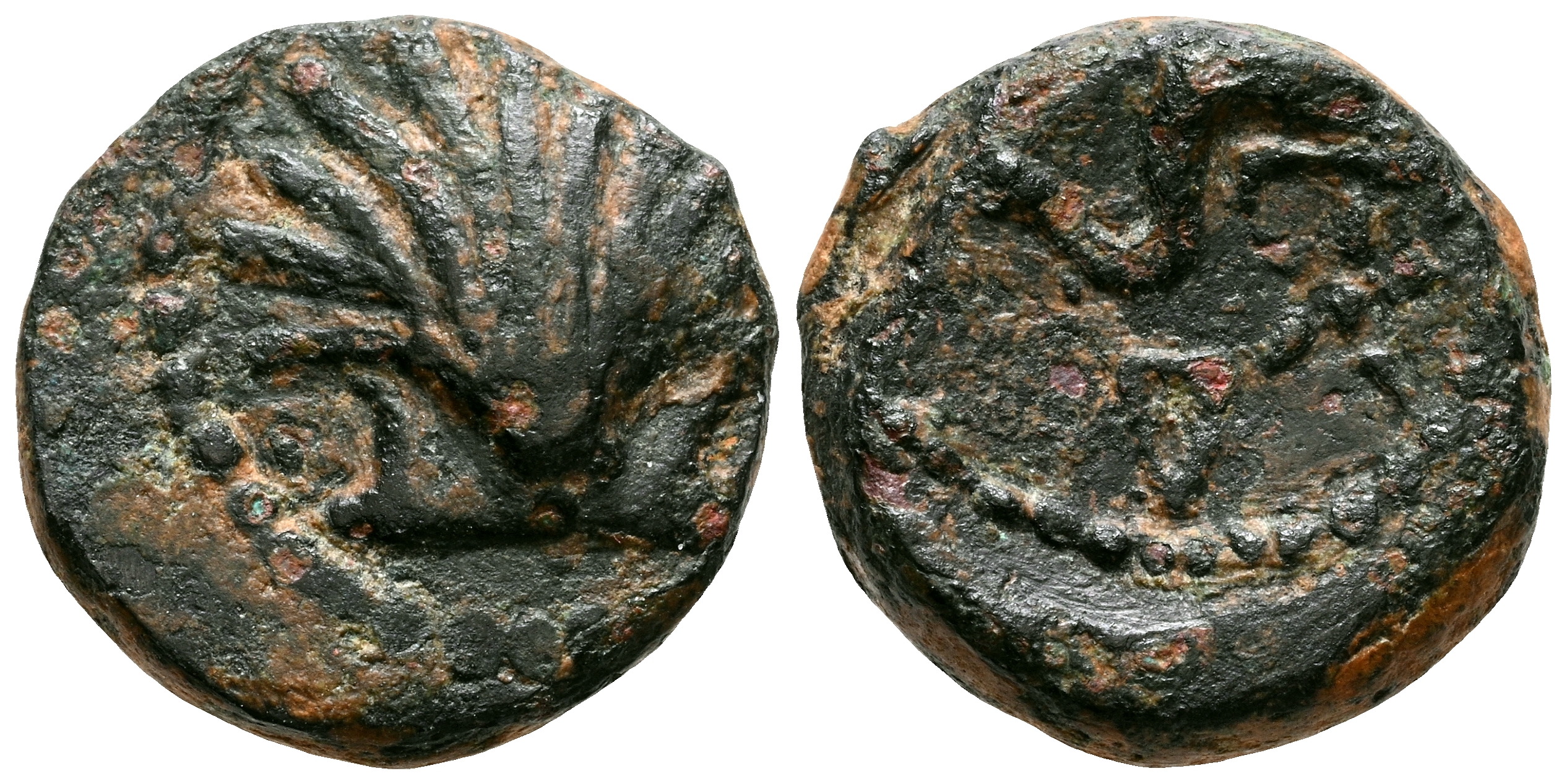 ARSE-SAGUNTO (Sagunto, Valencia). Sextante. (Ae. 2,19g/13mm). 170-20 a.C. (FAB-2064). Anv: Delfín, encima letra ibérica: A y creciente, debajo letras Ibéricas A, I y estrella. MBC.