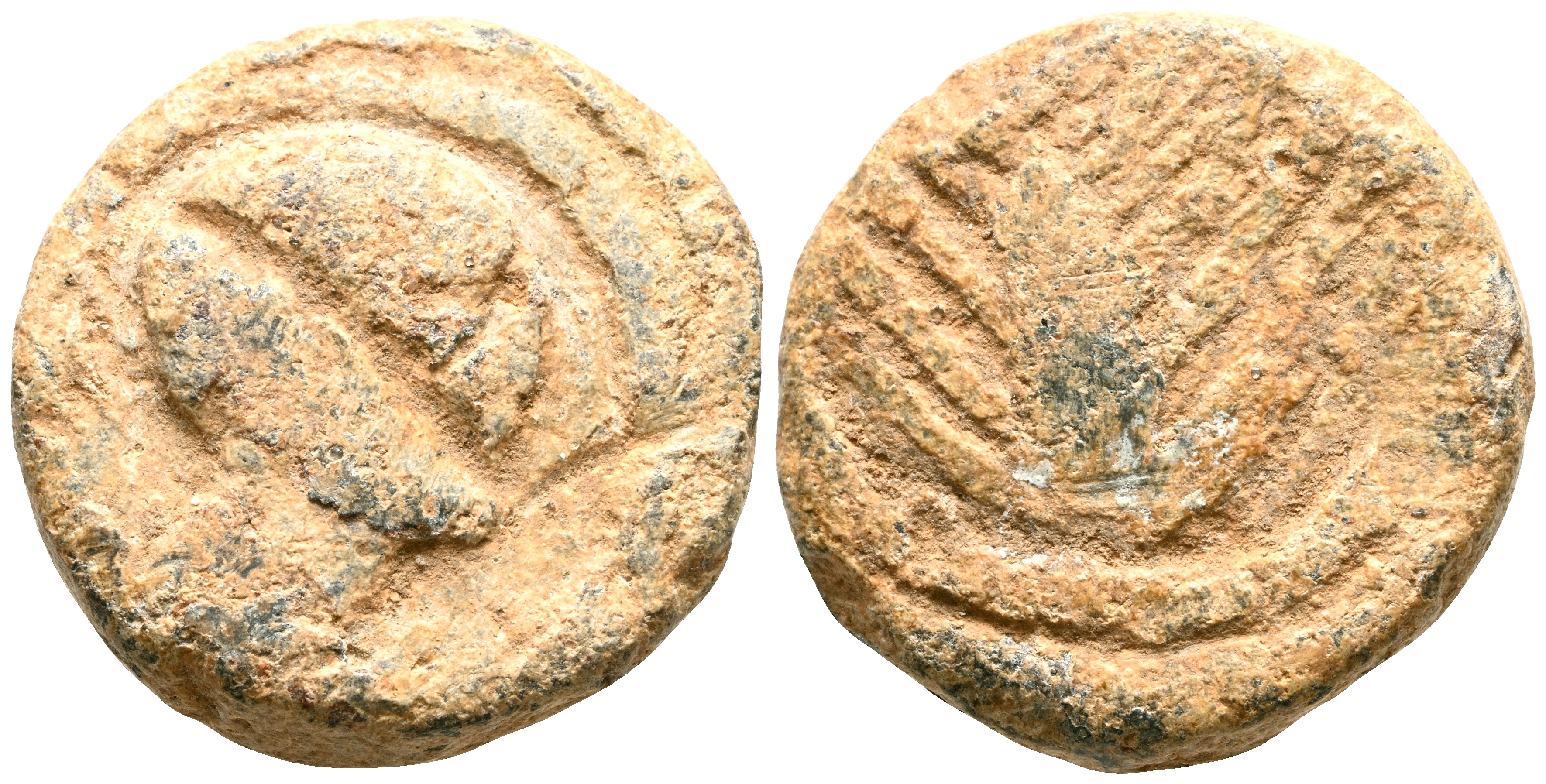 SEARO (Utrera, Sevilla). Plomo monetiforme. (Pb. 8,51g/18mm). 120-50 a.C. (CCP 19.1). Anv: Cabeza masculina a derecha. Rev: Espiga hacia arriba. MBC-.