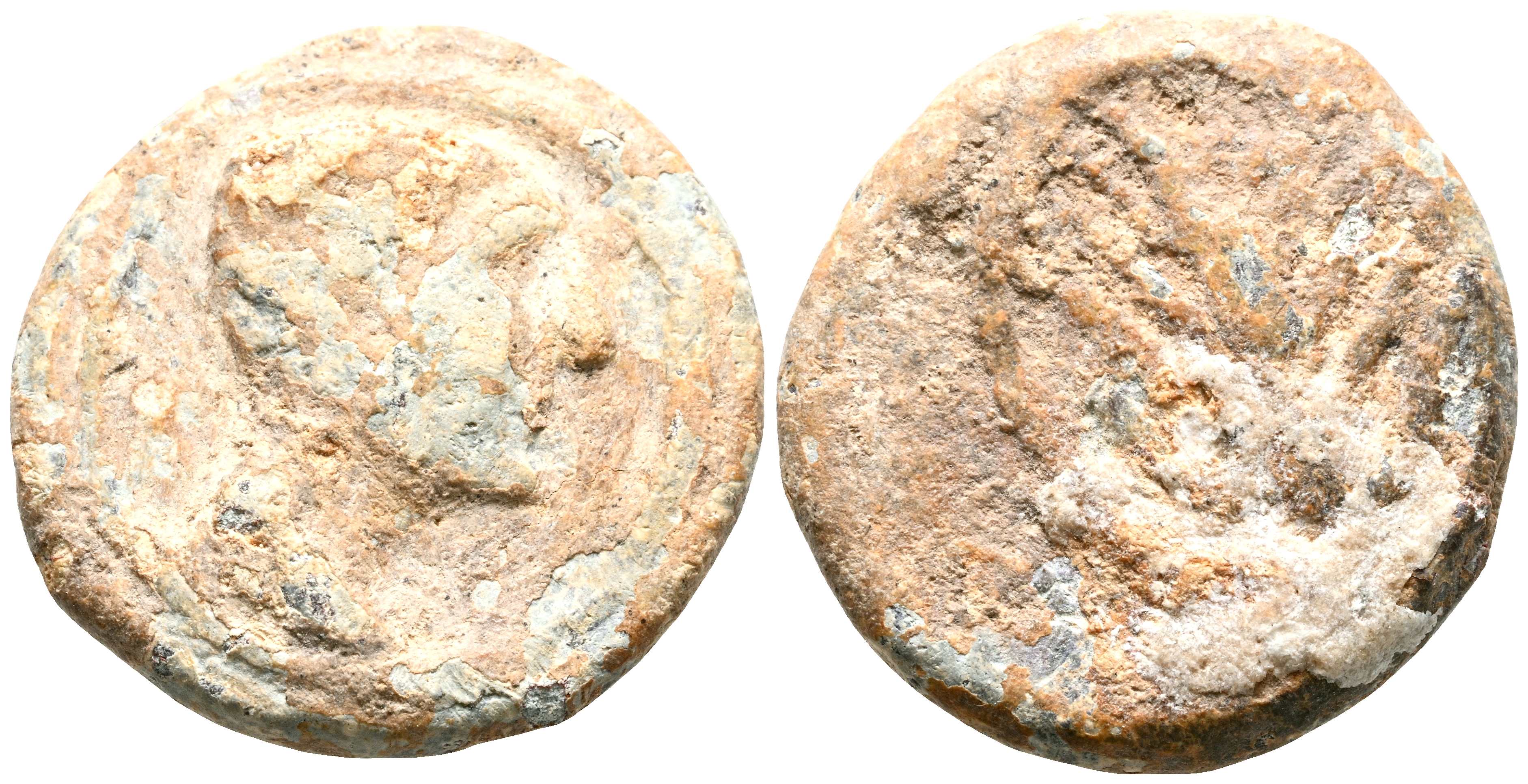 SEARO (Utrera, Sevilla). Plomo monetiforme. (Pb. 8,10g/19mm). 120-50 a.C. (CCP 19.1). Anv: Cabeza masculina a derecha. Rev: Espiga hacia arriba. MBC-.