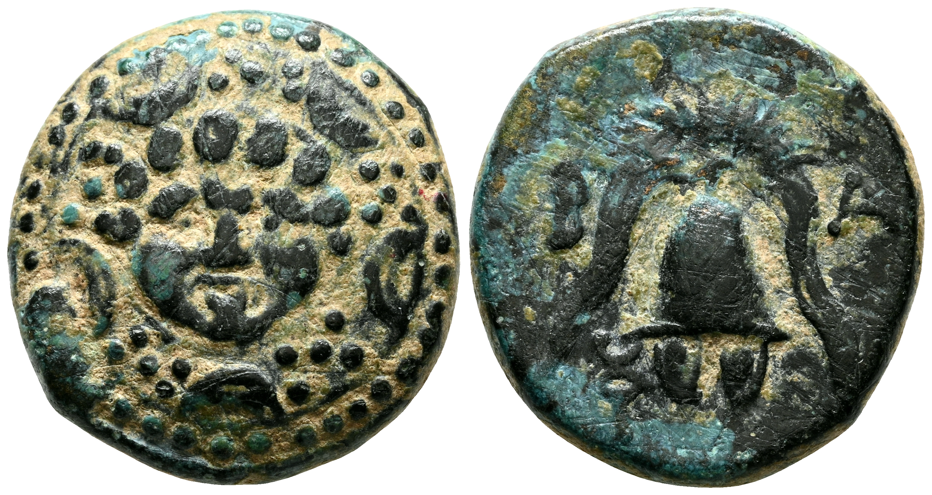 REYES DE MACEDONIA, Filipo III Arrhidaios. Ae16. (Ae. 4,44g/16mm). 323-317 a.C. Ceca incierta del oeste de Asia. (Price 2803). Anv: Cabeza de Heracles con piel de león a derecha dentro de escudo macedonio. Rev: Casco macedonio, a la izquierda monograma griego, a la derecha caduceo. MBC.