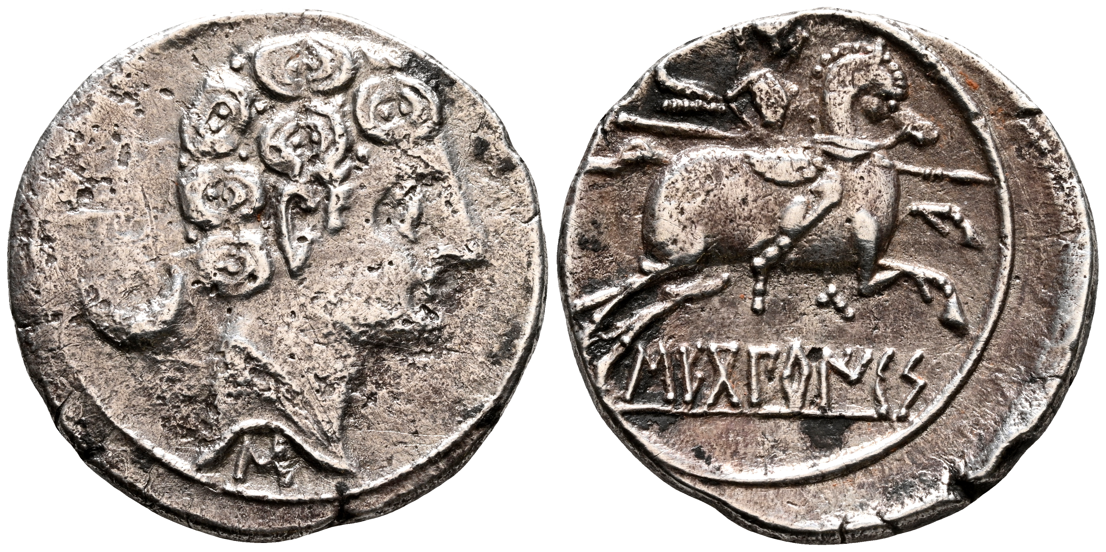 SECOBIRICES (Saelices, Cuenca). Denario. (Ar. 3,48g/19mm). 120-30 a.C. (FAB-2174). Anv: Cabeza masculina a derecha, detrás creciente, debajo letra ibérica: S. Rev: Jinete con lanza a derecha, asomando dos pies. MBC-/MBC. Oxidaciones limpiadas.