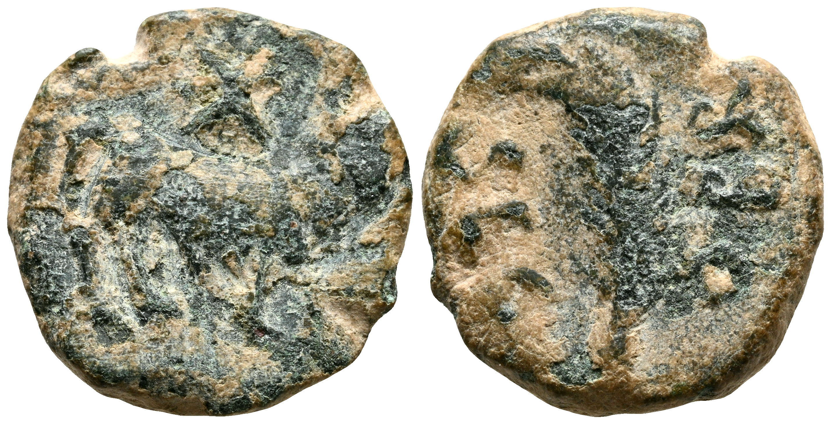 SEGOBRIGA (Saelices, Cuenca). Cuadrante. (Ae. 2,42g/15mm). 30-20 a.C. (FAB-2184). Anv: Toro a derecha, encima X entre tres puntos. Rev: Palma, alrededor leyenda: SECOBR. MBC-.