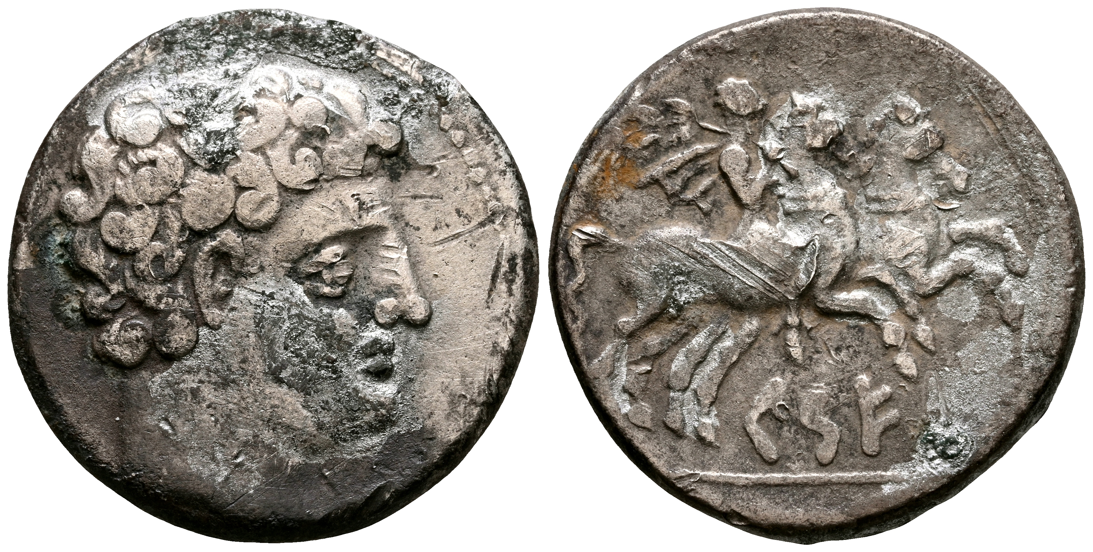 CESE (Tarragona). Denario. (Ar. 3,20g/18mm). 120-20 a.C. (FAB-2266). Anv: Cabeza masculina a derecha. Rev: Jinete con palma a derecha conduciendo segundo caballo, debajo leyenda ibérica sobre líne: CeSE. BC+. Limpiado. Fuerte rozadura en reverso.