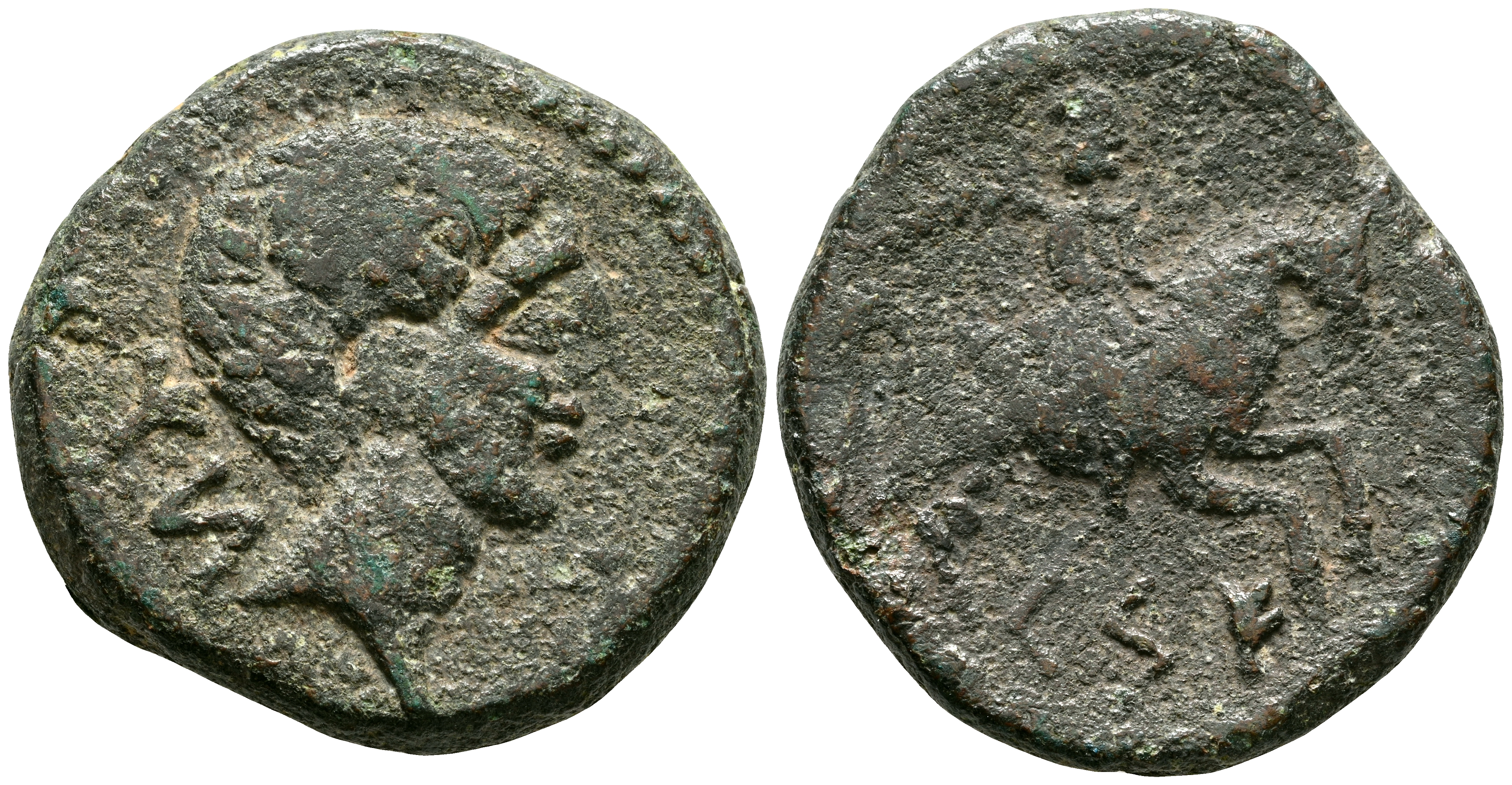 CESE (Tarragona). As. (Ae. 8,61g/24mm). 120-20 a.C. (FAB-2294). Anv: Cabeza masculina a derecha, detrás letras ibéricas: Ti y Gi. Rev: Jinete con palma a derecha, debajo leyenda ibérica: CeSE. MBC-.