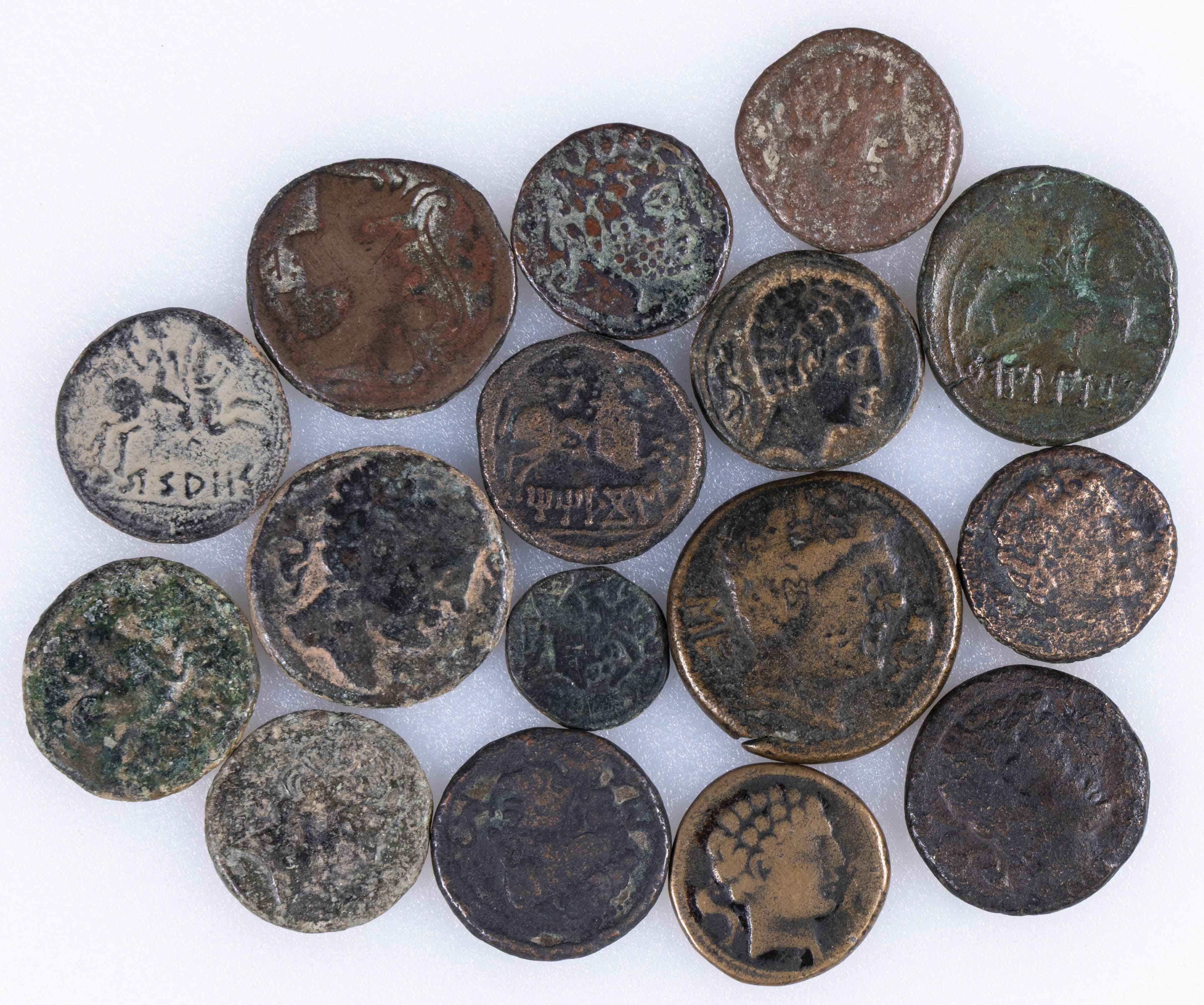 Muy interesante conjunto de 16 piezas de distintas cecas ibéricas, destacando: Arsaos, Unticescen, Ecualacos, Iltirta, entre otras. A EXAMINAR.