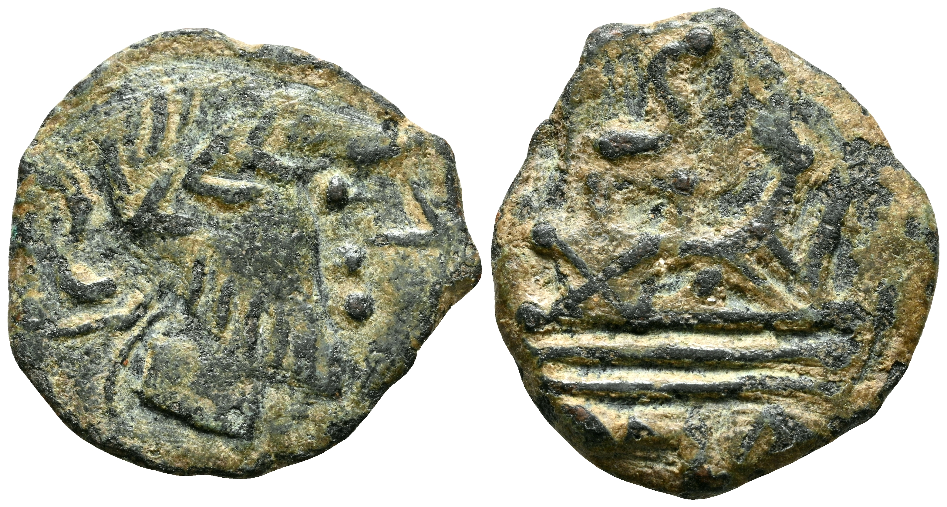 ACUÑACIONES ANONIMAS. Semis de imitación hispana. (Ae. 1,95g/16mm). 211 d.C. Incierto. (Crawford 56/3). Anv: Cabeza laureada de Saturno a derecha, detrás: S. Rev: Proa a derecha, encima: S, delante: creciente, debajo: ROMA. MBC.