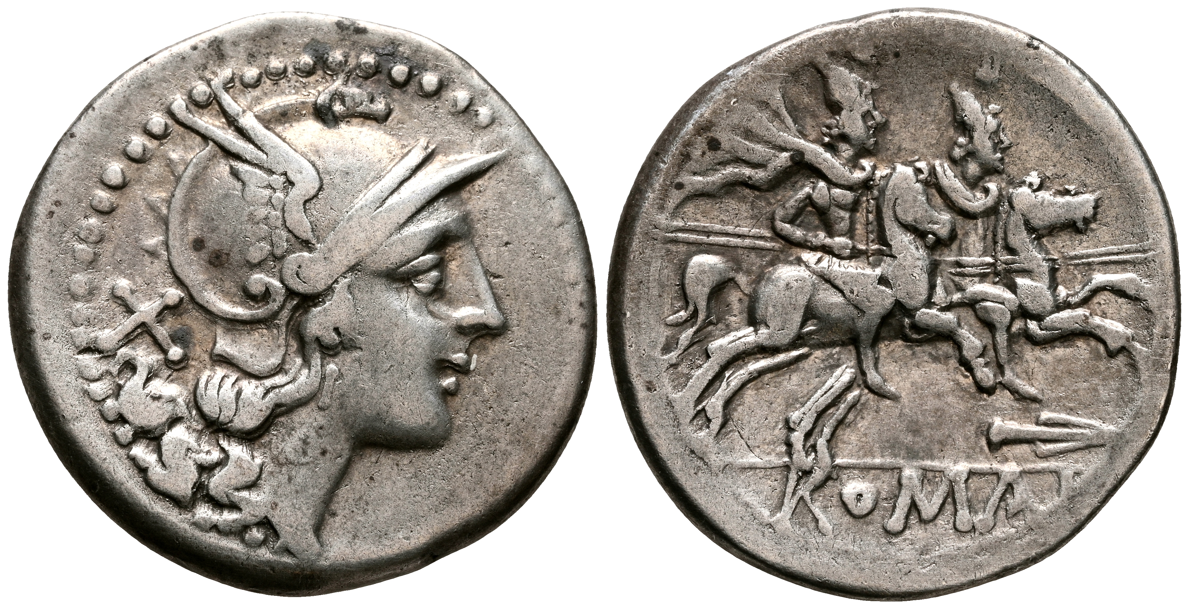 ACUÑACIONES ANÓNIMAS. Denario. (Ar. 3,98g/19mm). 208-200 d.C. Sudeste de Italia. (FFC 52; Crawford 88/2a). Anv: Cabeza de Roma con casco a derecha, detrás X. Rev: Dioscuros a caballo con lanza a derecha, encima de ambos estrellas, debajo punta de lanza a derecha, en exergo: ROMA. MBC.