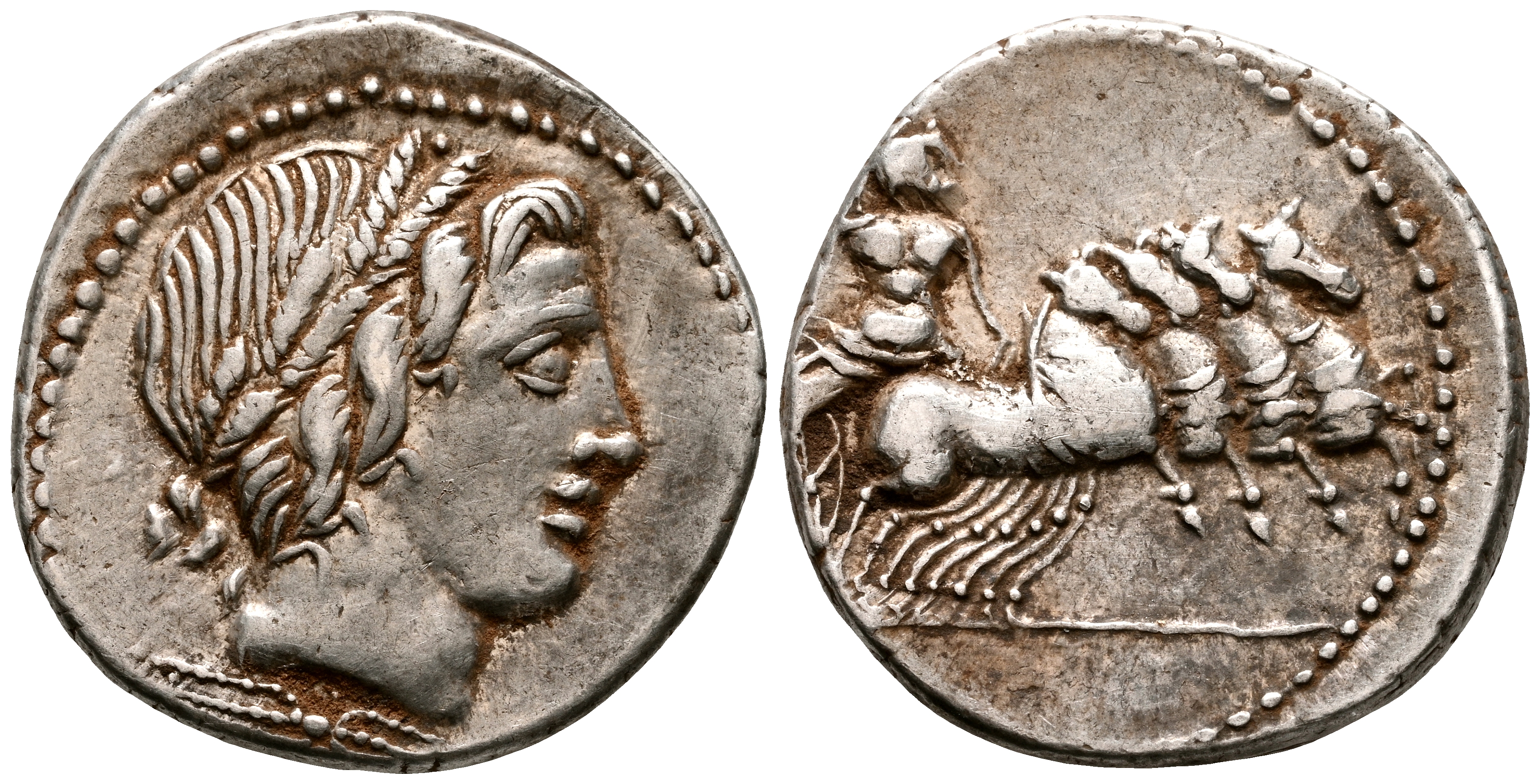ACUÑACIONES ANÓNIMAS. Denario. (Ar. 4,17g/19mm). 86 d.C. Roma. (FFC 85; Crawford 350/A2). Anv: Cabeza masculina a derecha, debajo haz de rayos. Rev: Júpiter con rayo sobre cuádriga a derecha. MBC+.