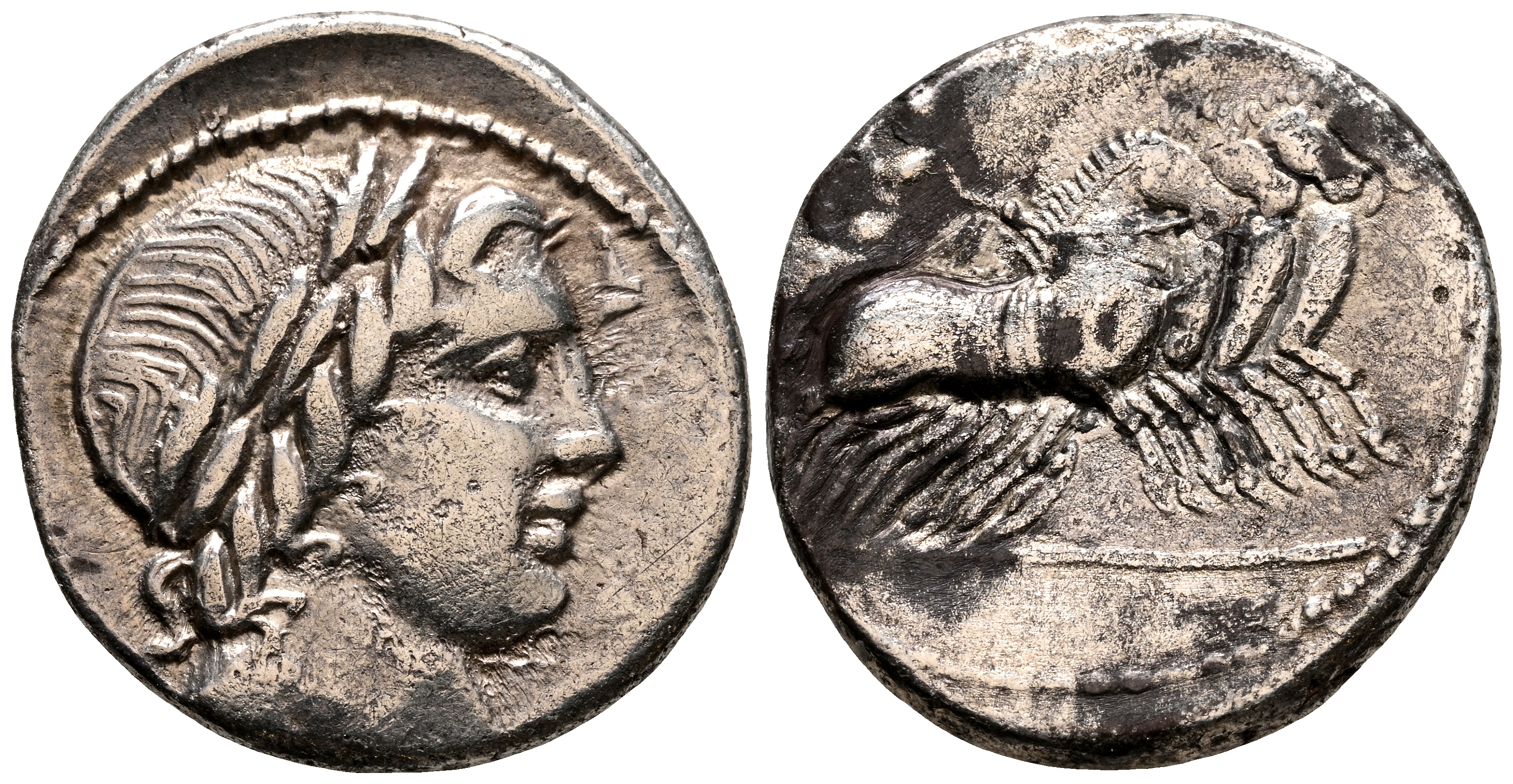 ACUÑACIONES ANONIMAS. Denario. (Ar. 3,46g/18mm). 86 a.C. Roma. (FFC 85; Crawford 350/A2). Anv: Cabeza masculina a derecha, debajo haz de rayos. Rev: Júpiter con rayo sobre cuádriga a derecha. MBC.
