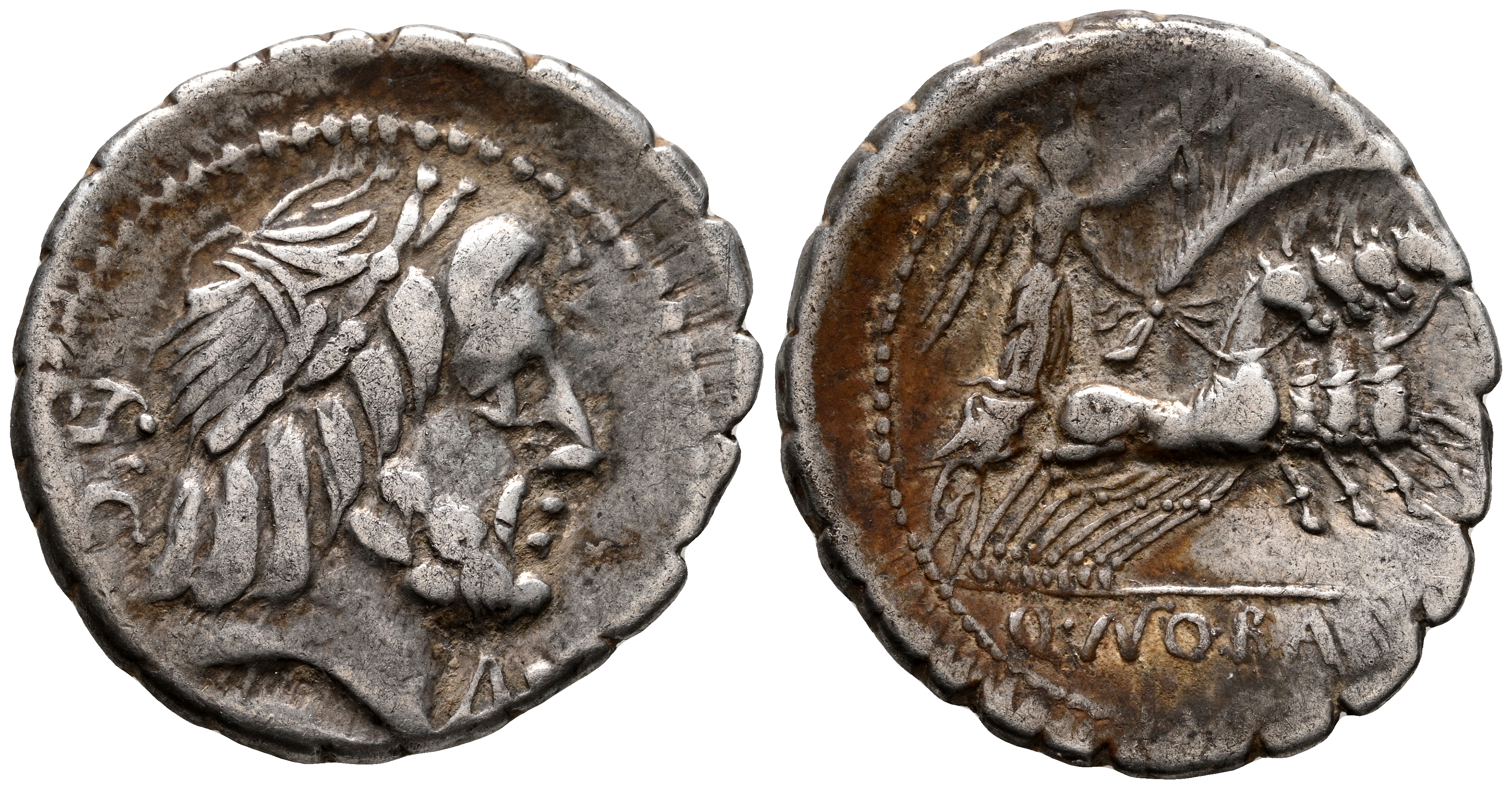 GENS ANTONIA. Denario. (Ar. 3,97g/20mm). 83-82 a.C. Taller auxiliar de Roma. (FFC 157; Crawford 364/1b). Anv: Cabeza laureada de Júpiter a derecha, detras SC, debajo letra S. Rev: Victoria en cuádriga a derecha con palma y corona de laurel, en exergo: Q ANTO BALB PR. MBC.