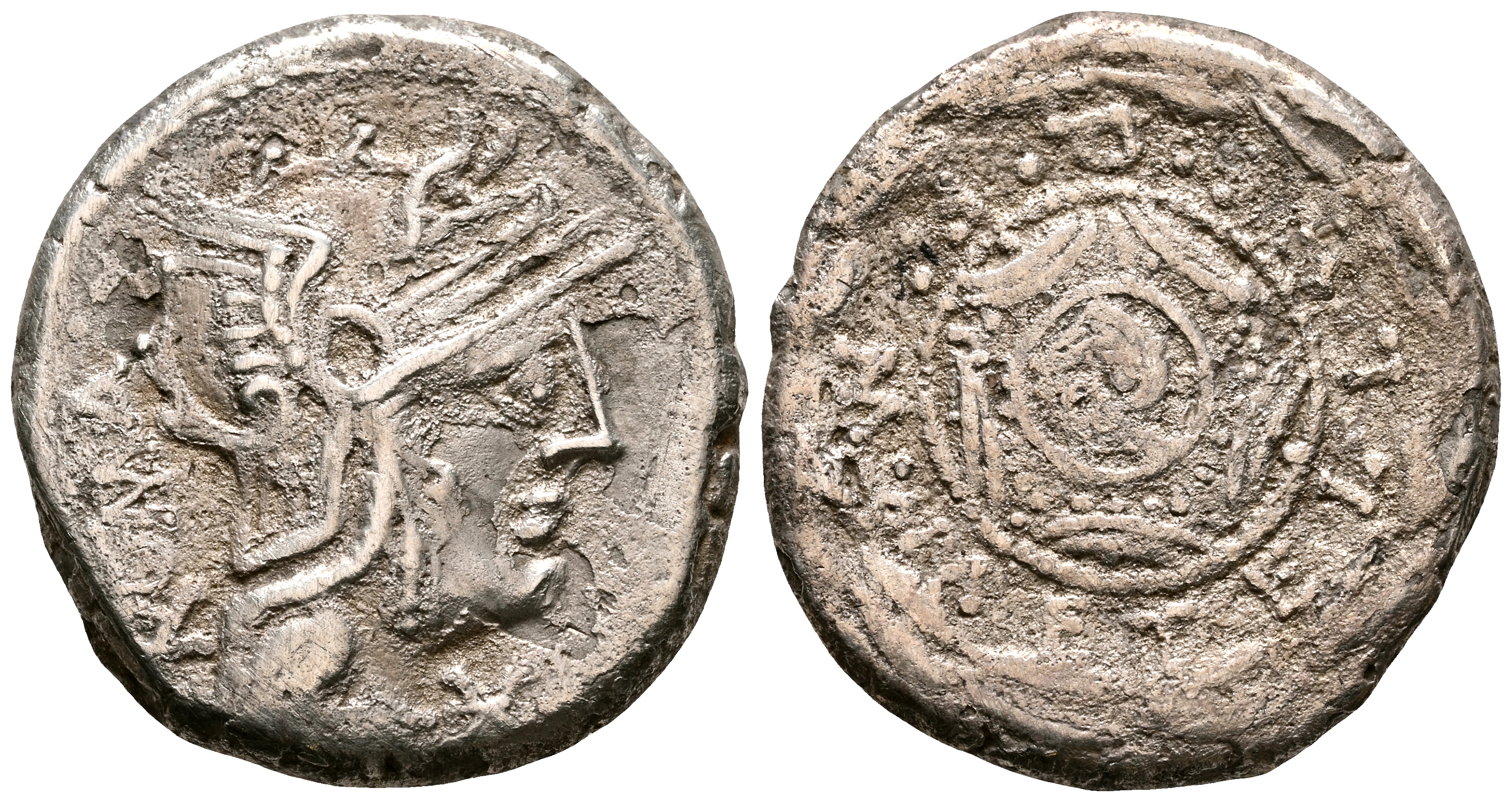 GENS CAECILIA. Denario. (Ar. 3,76g/18mm). 127 a.C. Roma. (FFC 205; Crawford 263/1a). Anv: Cabeza de Roma a derecha, delante estrella, detrás leyenda de abajo hacia arriba: ROMA. Rev: Escudo macedonio, alrededor leyenda dentro de corona de laurel: M METELLVS Q F. BC+.