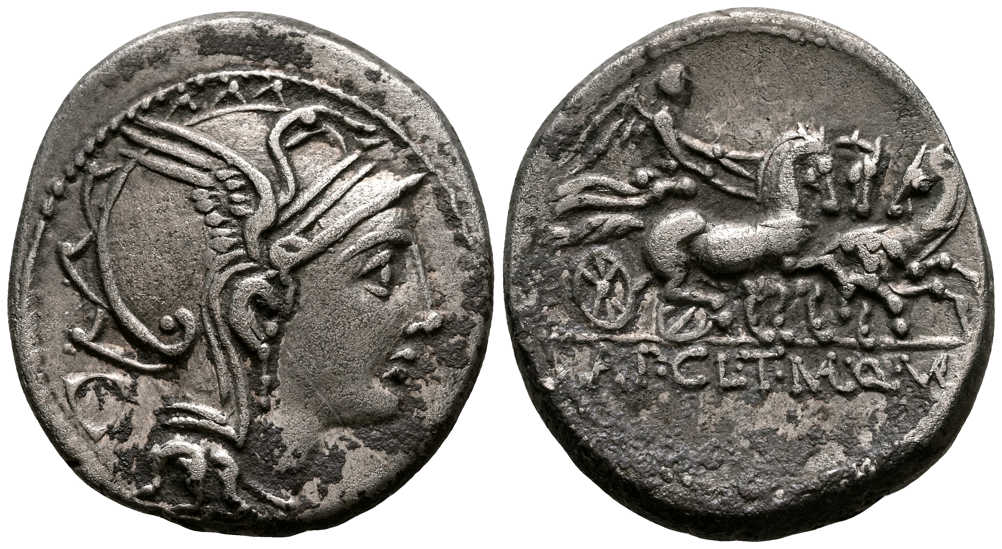 GENS CLAUDIA. Denario. (Ar. 3,73g/18mm). 110-109 d.C. Roma. (FFC 564; Crawford 299/1a). Anv: Cabeza de Roma a derecha, detrás objeto triangular. Rev: Victoria en triga a derecha, en exergo: AP CL T MANL Q VR. MBC. Oxidaciones.