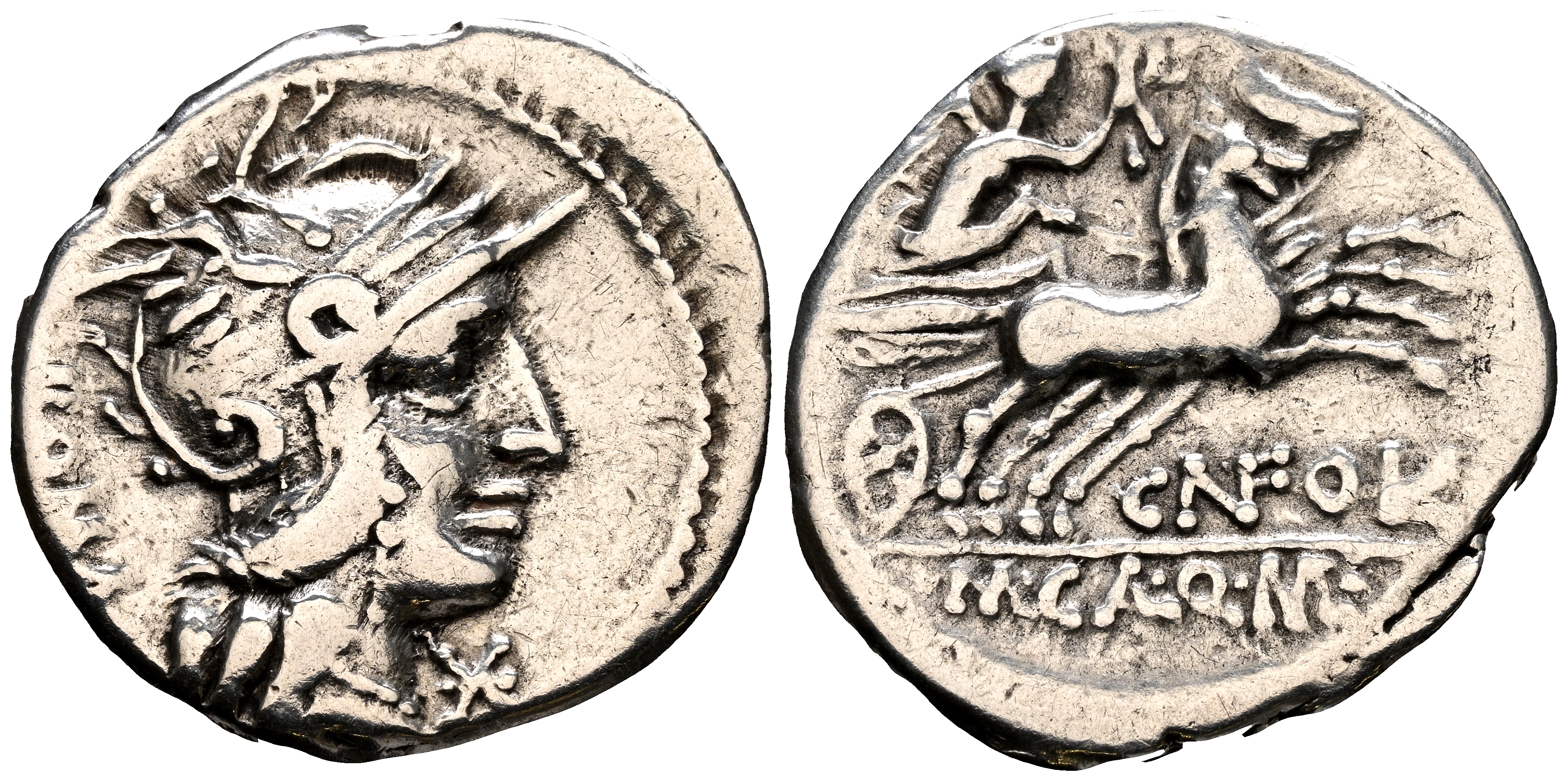 GENS FULVIA. Denario. (Ar. 3,66g/20mm). 117-111 a.C. Norte de Italia. (Crawford 284/1b; FFC 726). Anv: Cabeza de Roma a derecha, delante estrella, detrás leyenda: ROMA. Rev: Victoria con corona de laurel sobre biga a derecha, debajo leyenda: CN FOVL, en exergo: M CAL Q MET. MBC.