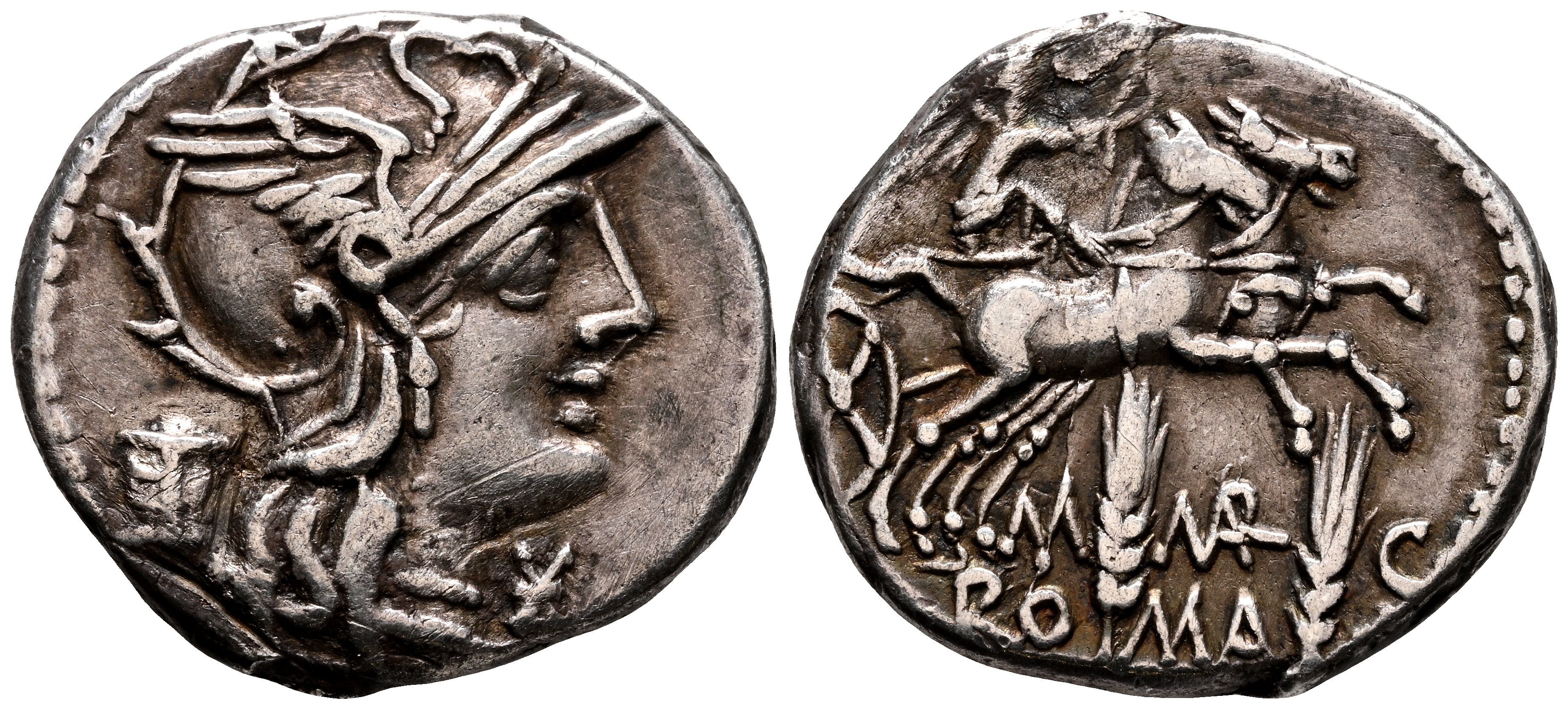 GENS MARCIA. Denario. (Ar. 3,82g/19mm). 134 a.C. Roma. (FFC 850; Crawford 245/1). Anv: Cabeza de Roma a derecha, delante estrella, detrás modio. Rev: Victoria con látigo conduciendo biga a derecha, debajo dos espigas con leyenda entre ellas: M MAR C/ROMA. MBC.