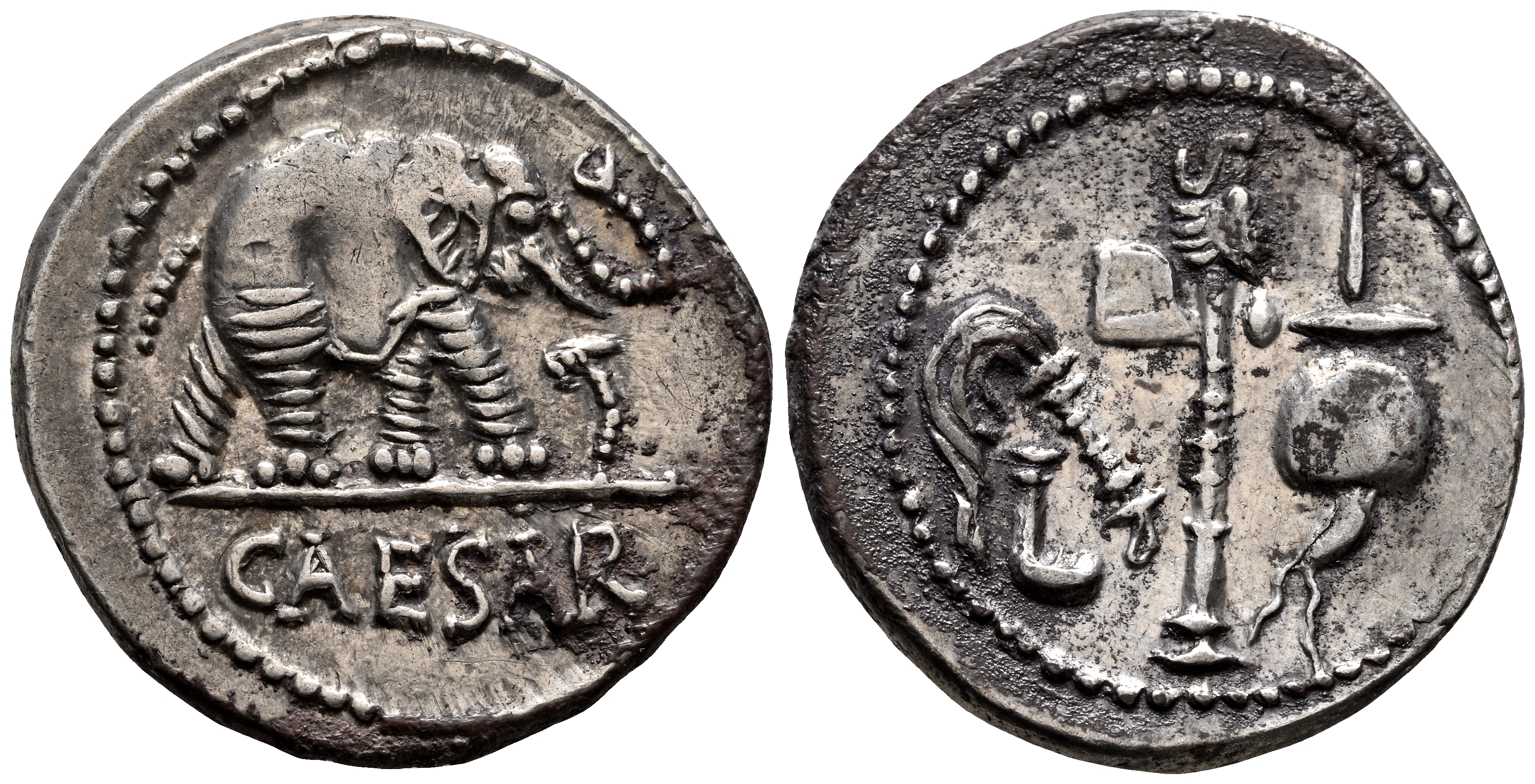 JULIO CESAR. Denario. (Ar. 3,82g/19mm). 49-48 a.C. Ceca militar móvil. (FFC 50; Crawford 443/1). Anv: Elefante avanzando a derecha, delante serpiente, debajo leyenda: CAESAR. Rev: Emblemas del pontificado: simpulum, aspergilum, securis (coronado por carbeza de lobo) y apex. EBC. Restos de brillo original. Escaso ejemplar.