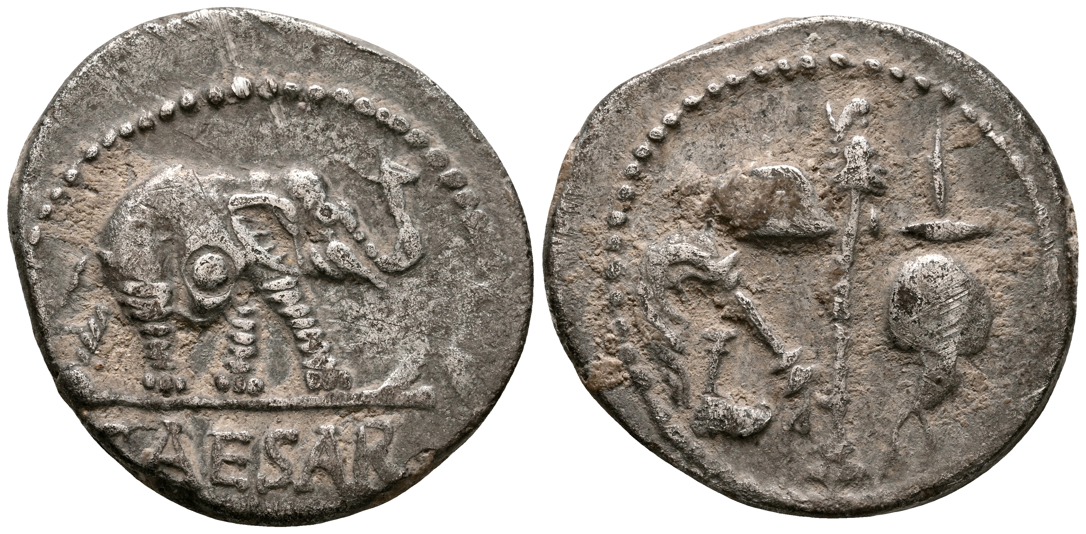 JULIO CESAR. Denario. (Ar. 3,83g/19mm). 49-48 a.C. Ceca militar móvil. (FFC 50; Crawford 443/1). Anv: Elefante avanzando a derecha, delante serpiente, debajo leyenda: CAESAR. Rev: Emblemas del pontificado: simpulum, aspergilum, securis (coronado por carbeza de lobo) y apex. MBC-. Contramarca en anverso. Escaso ejemplar.