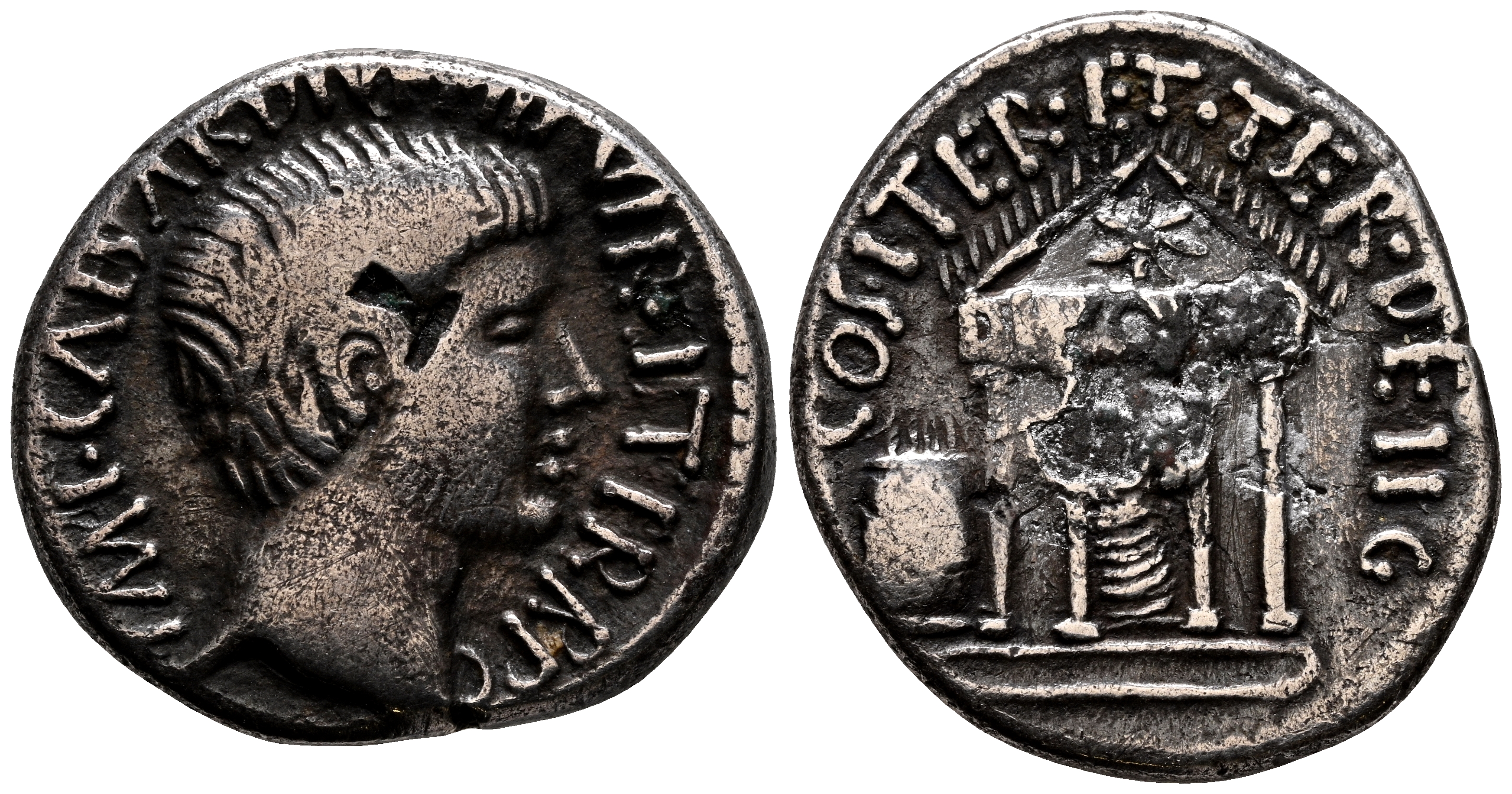 OCTAVIO. Denario .(Ar. 3,27g/19mm). 36 a.C. Ceca de del centro o el sur de Italia. (Crawford 540/2). Anv: Cabeza de Augusto a derecha, alrededor leyenda: IMP CAESAR DIVI F III VIR ITER R P C. Rev: Templo tetrástilo, dentro Julio Augusto estante de frente con lituus, en el frontón estrella, a la izquierda altar, encima leyenda: COS ITER ET TER DESIG. MBC-. Escaso. Oxidación en reverso.