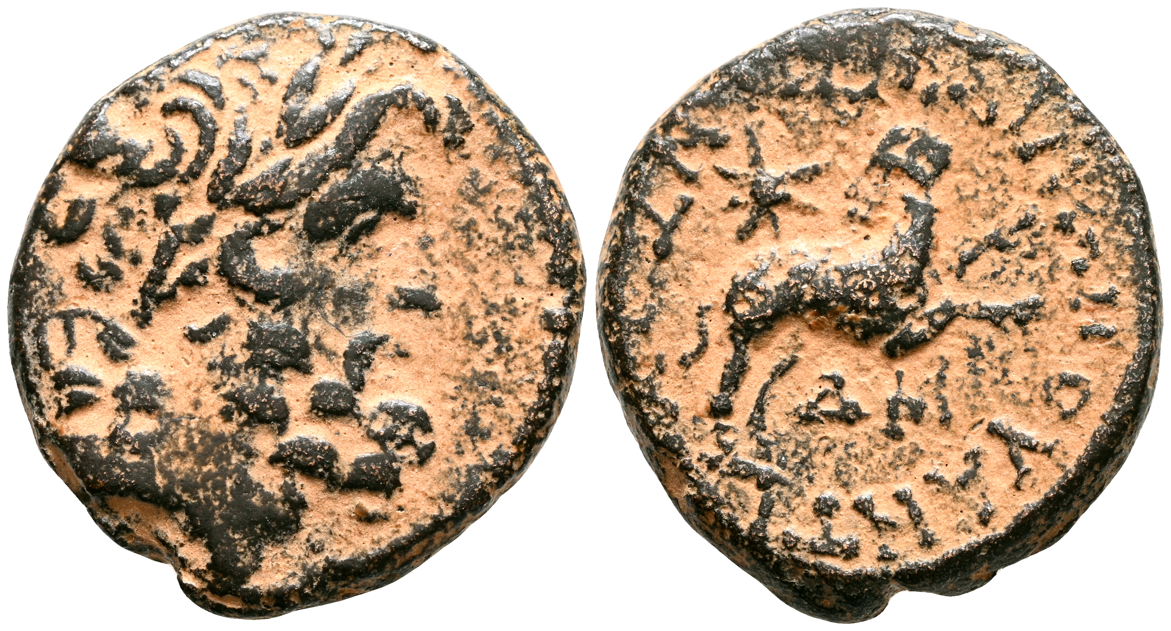 AUGUSTO, Acuñación pseudo-autónoma. Ae21. (Ae. 7,41g/21mm). 5-6 d.C. Seleucis y Pieria, Antioquía. (RPC 4265; McAlee 95). Anv: Cabeza laureada de Zeus a derecha. Rev: Carnero saltando a derecha,mirando a izquierda, encima estrella, debajo monograma: AM, alrededor leyenda: ΑΝΤΙΟΧΕΩΝ ΜΗΤΡΟΠΟΛEΩΣ. MBC.