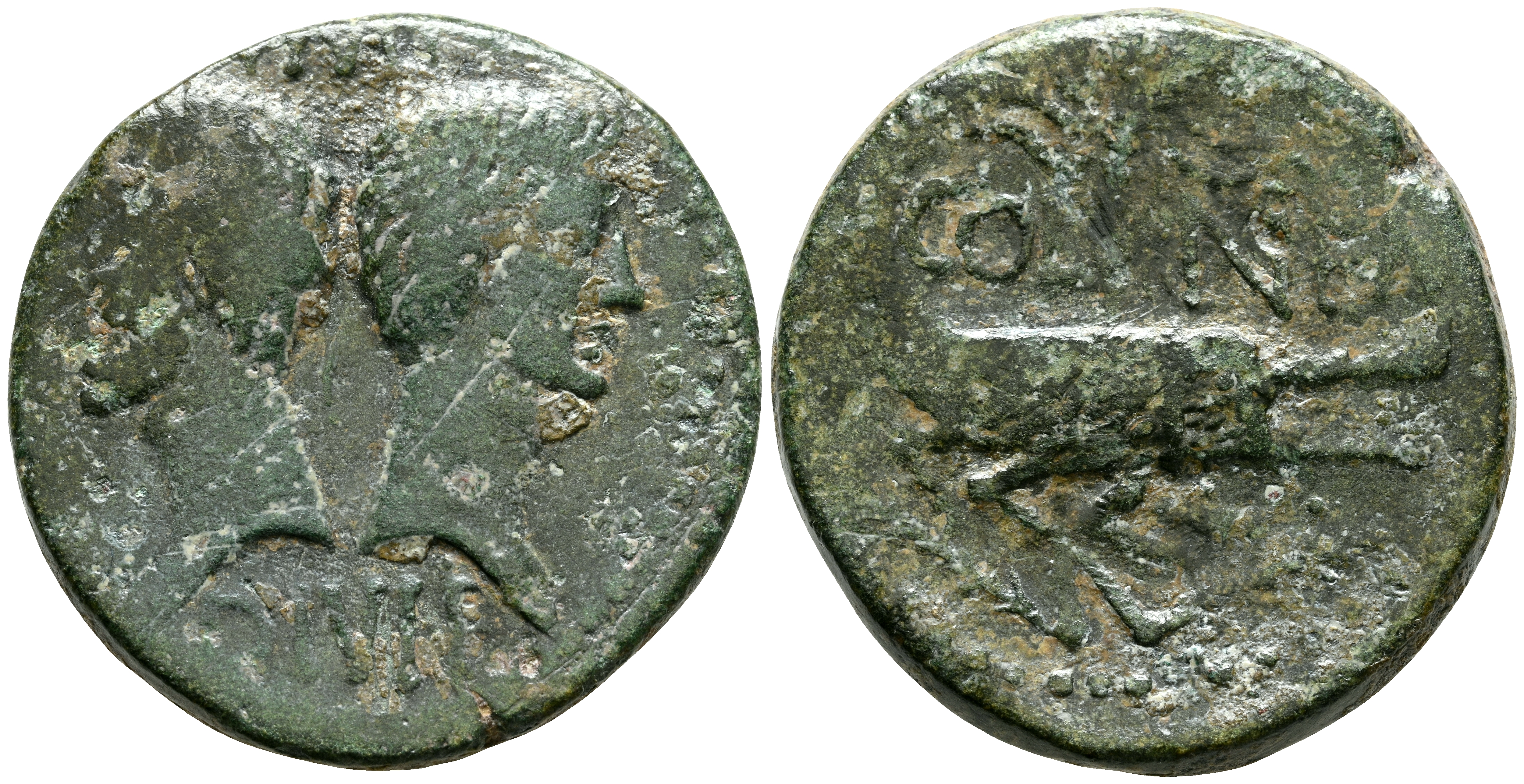AUGUSTO. As. (Ae. 12,52g/25mm). 10-14 d.C. Colonia Nemasus. (RIC 158). Anv: Busto laureado de Augusto a izquierda, detrás busto laureado de Agripa a derecha, encima: IMP, debajo: DIVI F. Rev: Cocodrilo a derecha atado a palma, en campo corona de laurel, encima COL-NEM. MBC-. Escaso ejemplar.