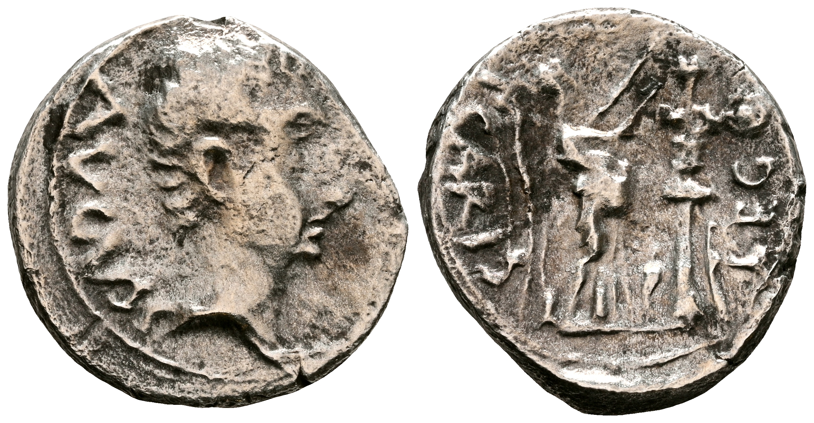 AUGUSTO. Quinario. (Ar. 1,36g/13mm). 25-23 d.C. Emérita Augusta. (RIC 1a). Anv: Cabeza de Augusto a derecha, detrás leyenda: AVGVSTVS. Rev: Victoria estante a derecha coronando trofeo, alrededor leyenda: P CARISI LEG. MBC-. Limpiado.
