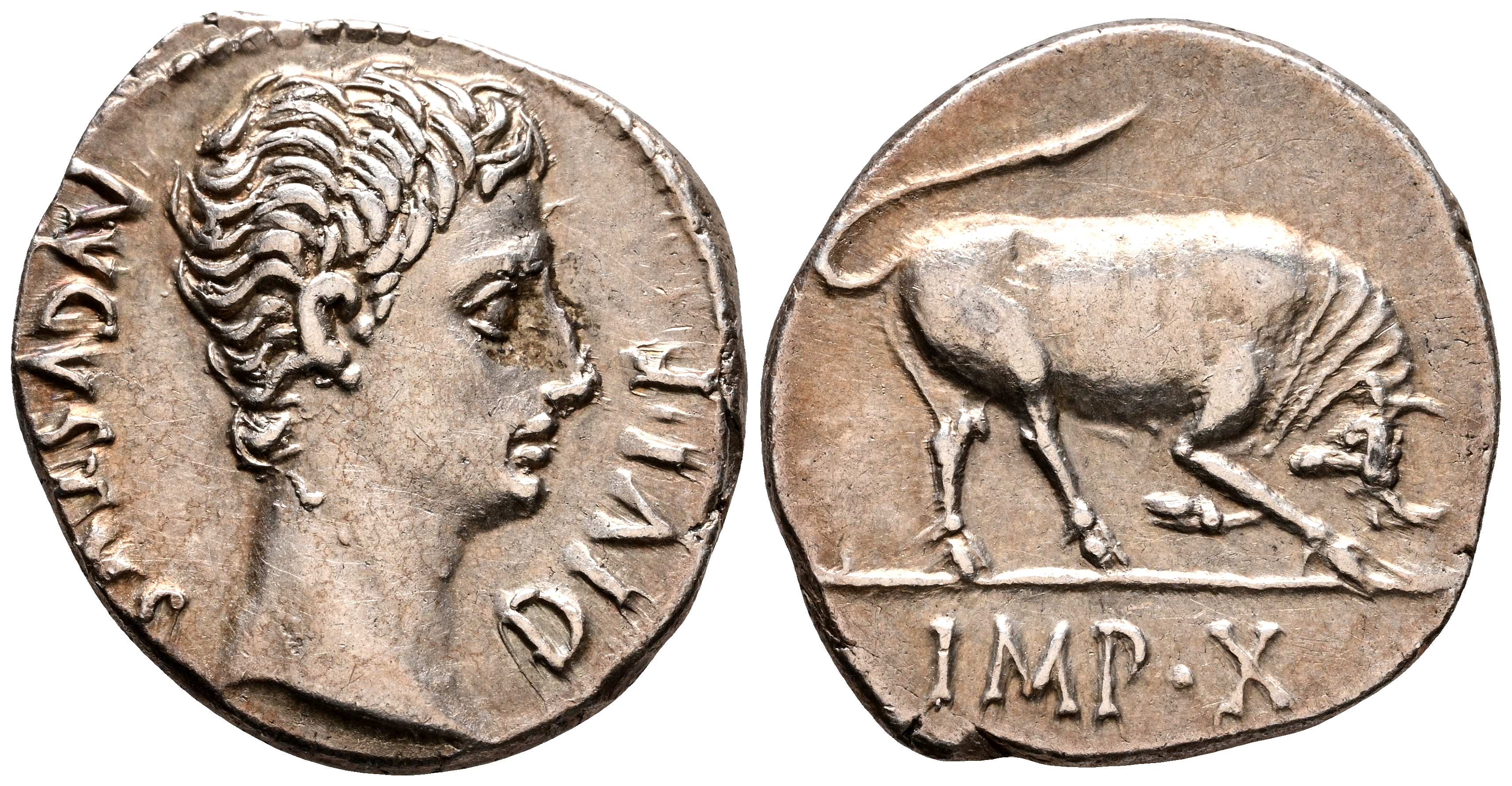 AUGUSTO. Denario. (Ar. 3,77g/19mm). 15 a.C. Lugdunum. (RIC 167a). Anv: Cabeza de Augusto a derecha, alrededor leyenda: AVGVSTVS DIVI F. Rev: Toro embistiendo a derecha, en exergo: IMP X. EBC-. Ligero y atractivo tono. Escaso así.