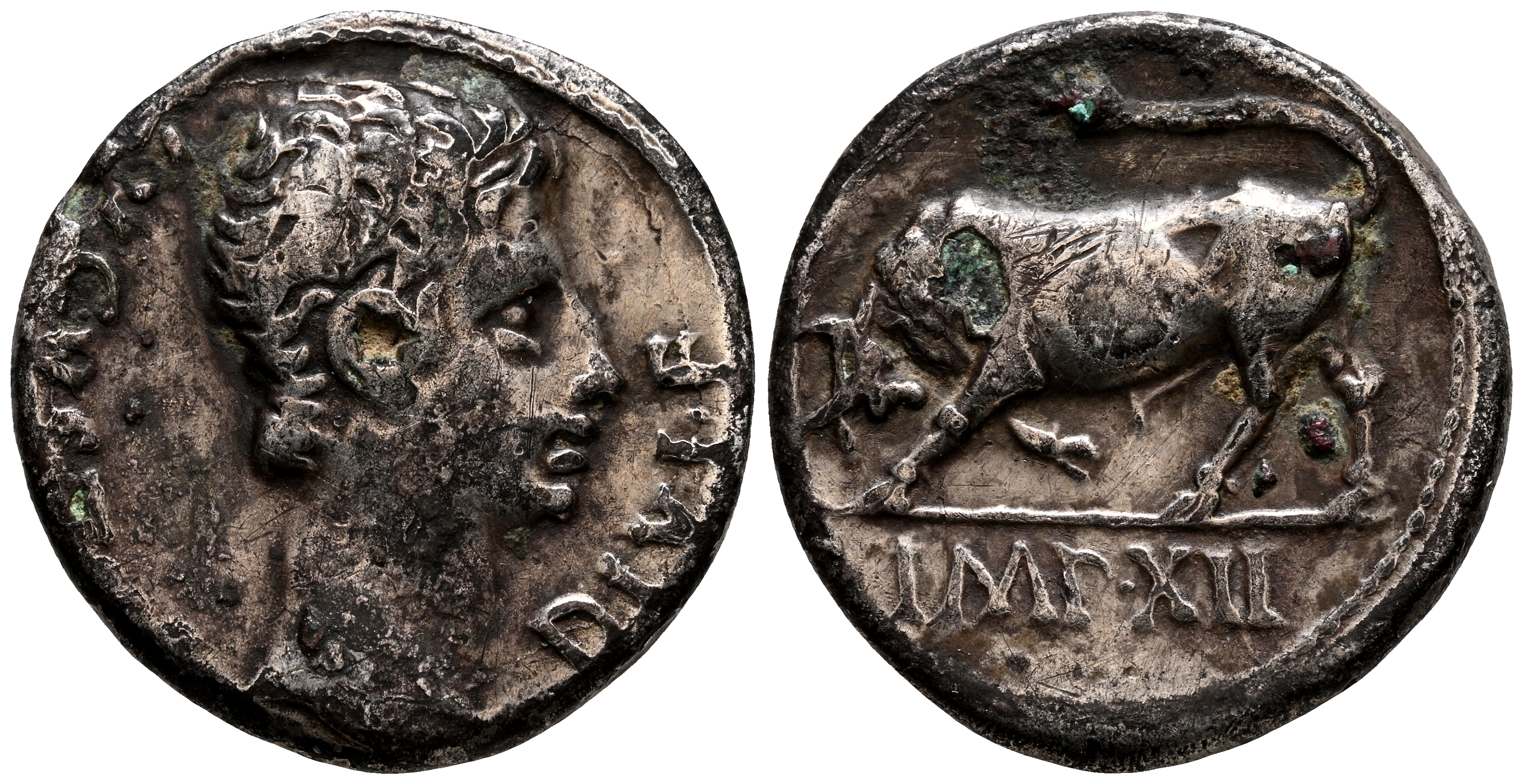 Augusto. Denario Forrado. (Ar-Ae. 3,29g/18mm). 11-10 a.C. Lugdunum. (RIC 169). Anv: Cabeza descubierta de Augusto a derecha, alrededor leyenda: AVGVSTVS DIVI F. Rev: Toro a izquierda, en el exergo: IMP XII. MBC. Escaso ejemplar.