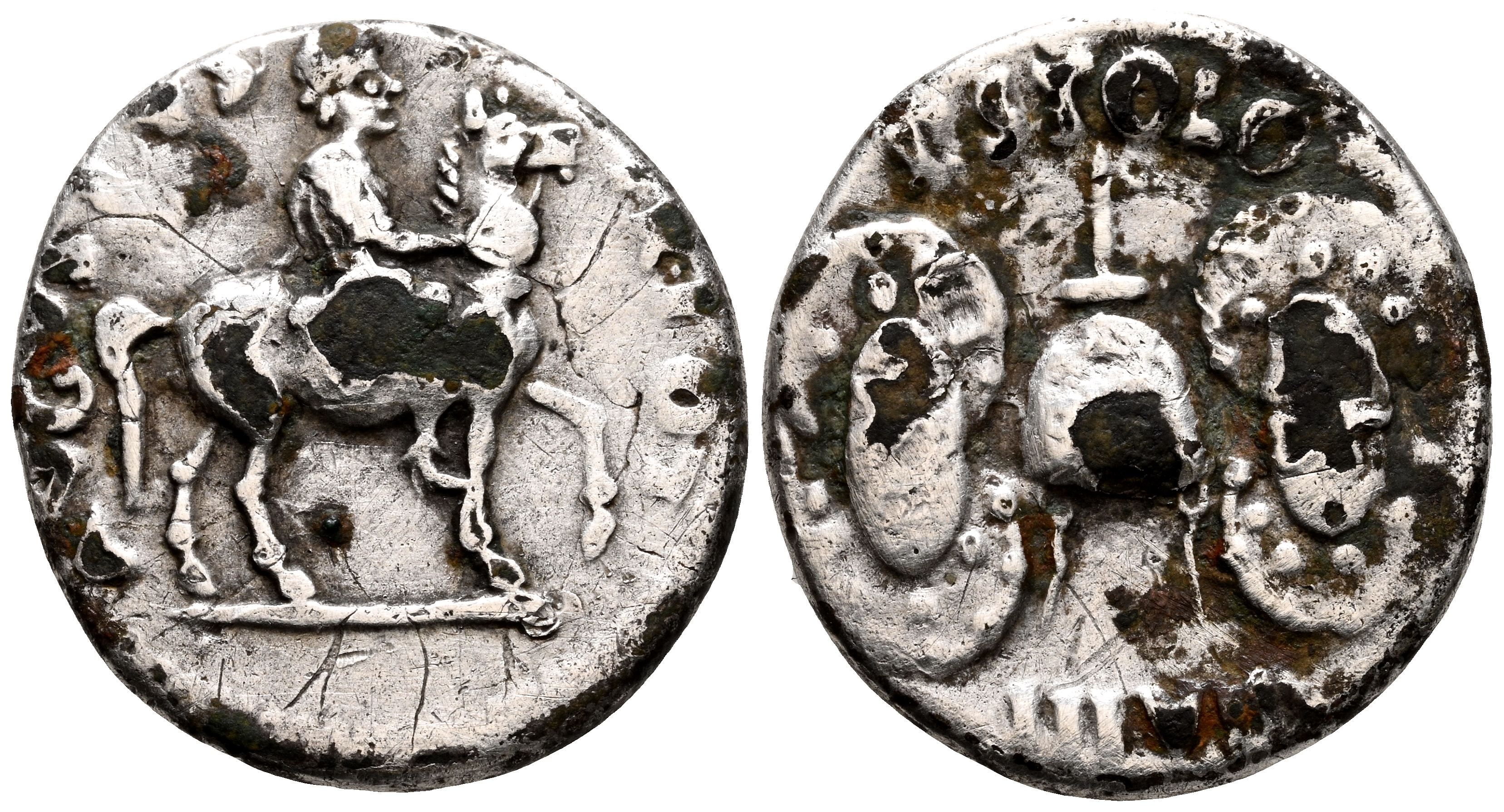 AUGUSTO. Denario forrado (Ar-Ae. 2,86g/18mm). 17 a.C. Roma. (RIC 344; Cohen 439). Anv: Augusto con atuendo militar montado a caballo hacia la derecha, sosteniendo en la mano derecha una patera, alrededor leyenda: AVGVSTVS TR POT. Rev: Casco de flamen dialis entre dos escudos en forma de ocho, alrededor leyenda: P STOLO/III VIR. MBC. Raro ejemplar.