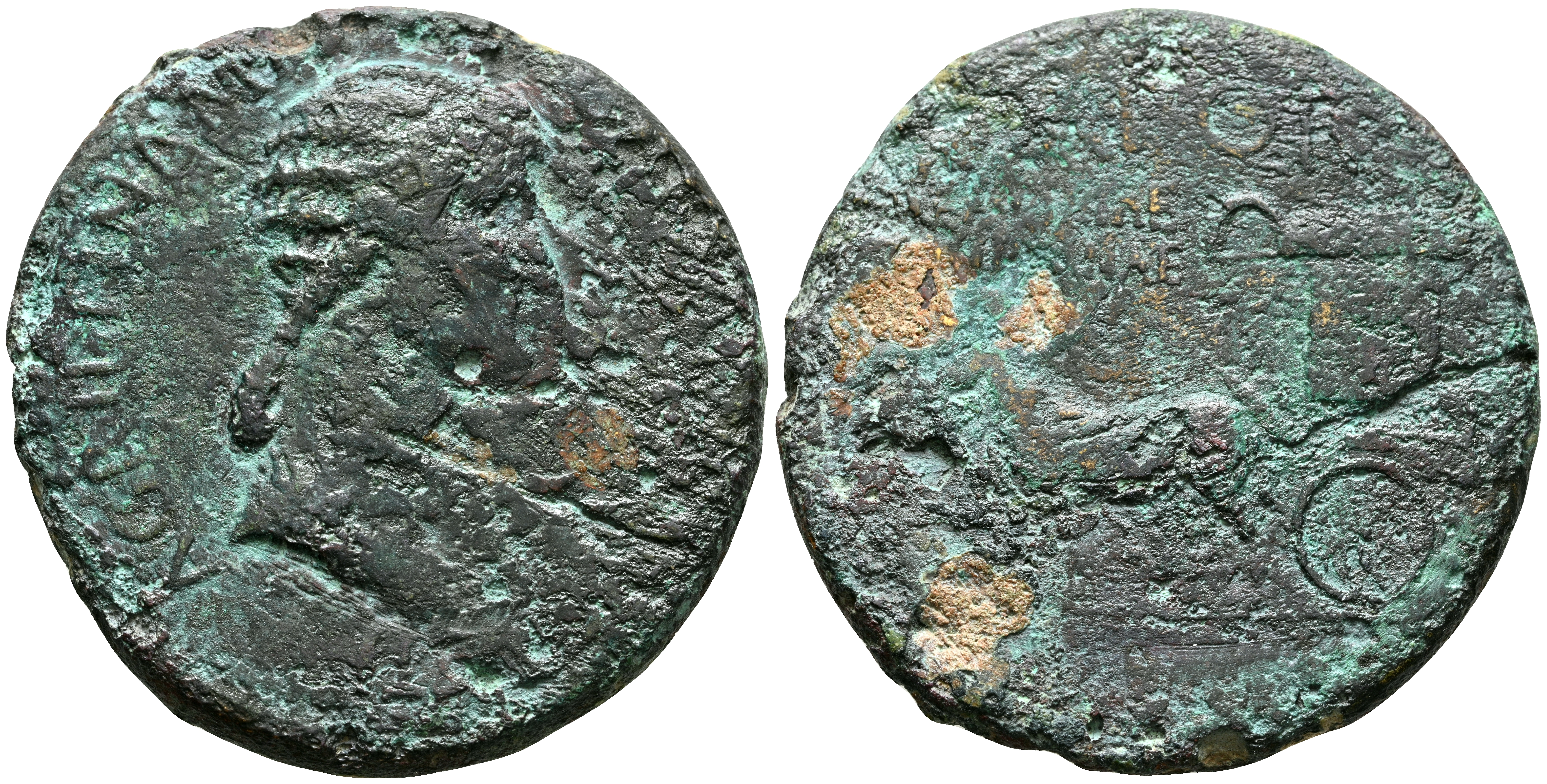 AGRIPINA. Sestercio. (Ae. 17,54g/32mm). 37-41 d.C. Roma. (RIC 55). Anv: Busto drapeado de Agrippina a derecha, alrededor leyenda: AGRIPPINA M F MAT C CAESARIS AVGVSTI. Rev: Carpentum a izquierda tirado por dos mulas, cubierto y decorado, en su interior dos figuras estantes, encima SPQR y debajo en dos líneas: MEMORIAE/AGRIPPINAE. BC. Raro ejemplar.