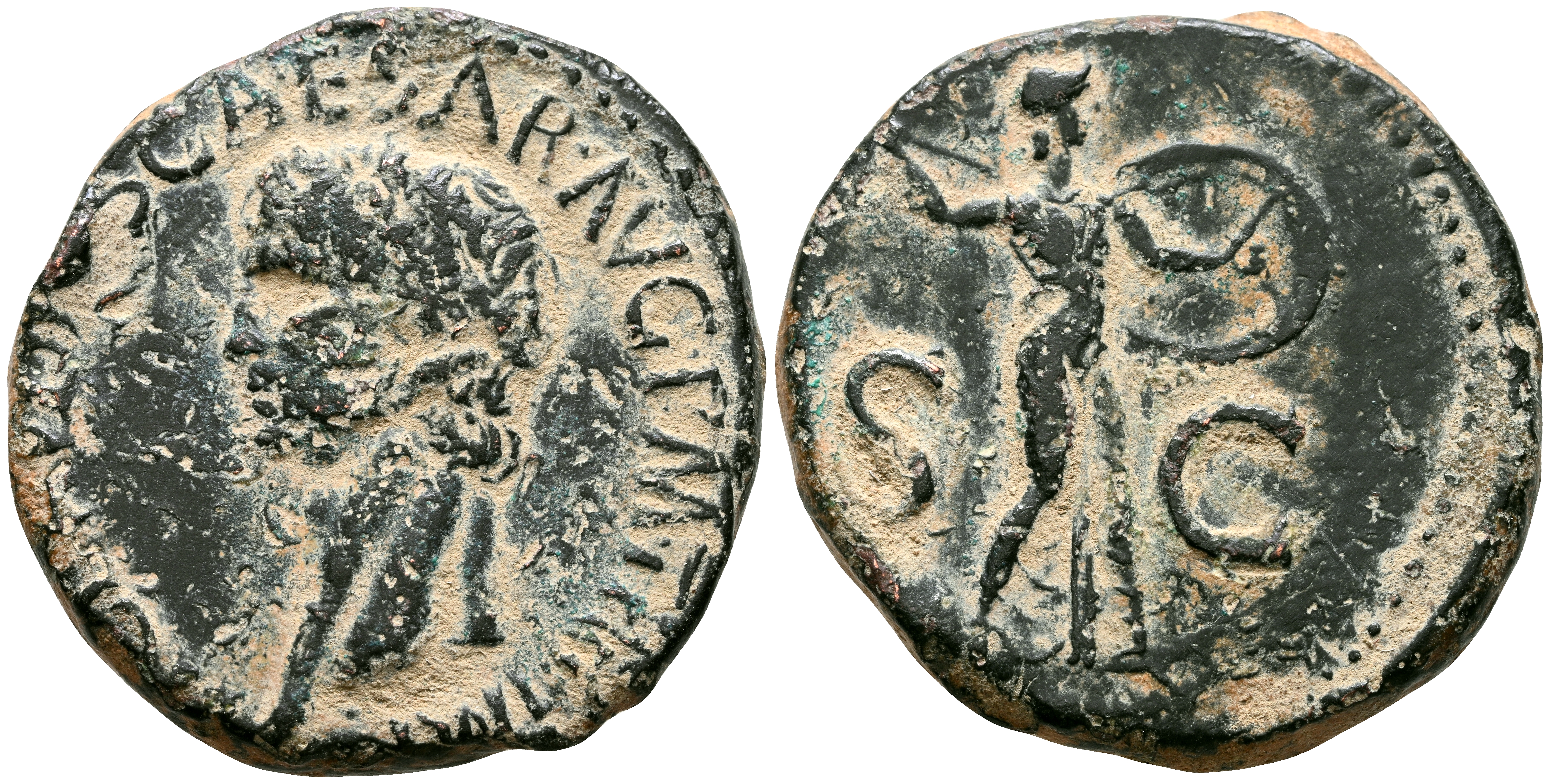 CLAUDIO I. As. (Ae. 13,08g/28mm). 41-50 d.C. Roma. (RIC 100). Anv: Cabeza de Claudio I a izquierda, alrededor leyenda: TI CLAVDIVS CAESAR AVG P M TR P IMP. Rev: Minerva avanzando a derecha portando lanza y escudo, en campo S-C. MBC-.