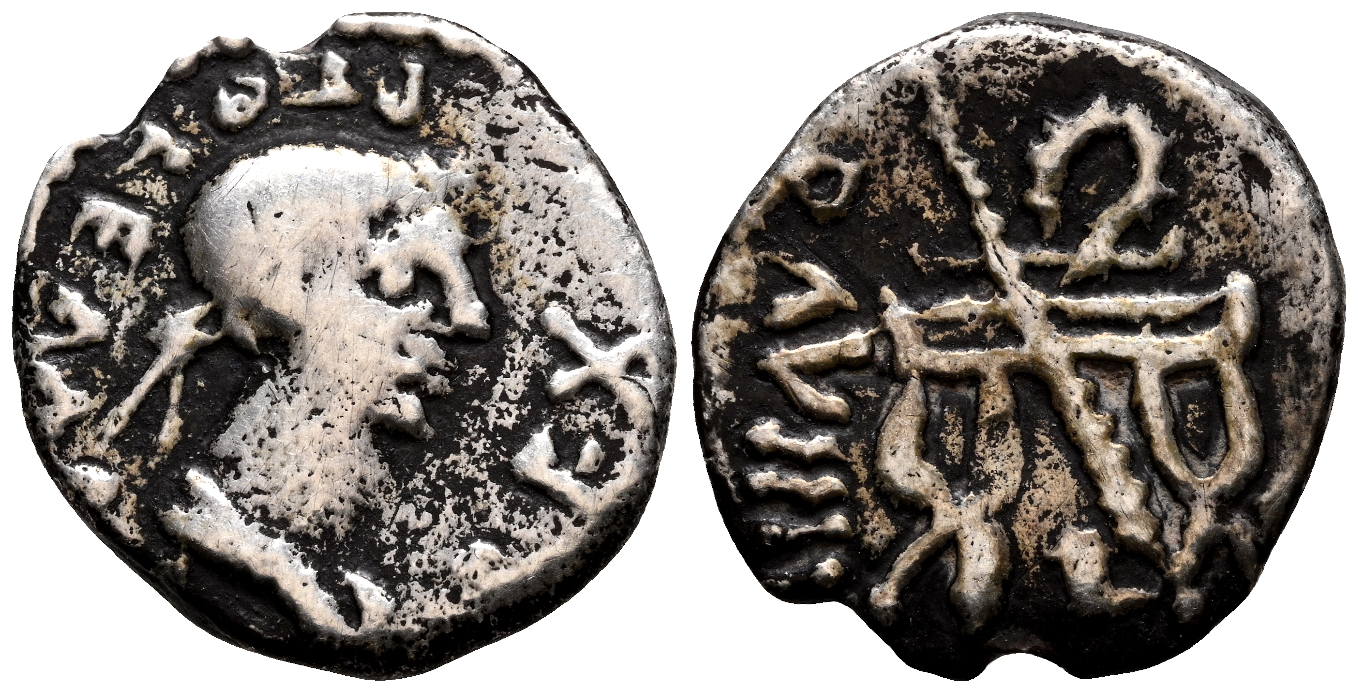 REYES DE MAURITANIA, Ptolomeo. Denario. (Ar. 1,91g/14mm). 28-30 d.C. (Año 9). Cesarea. (Mazard 444; MAA 295). Anv: Cabeza diademada Ptolomeo a derecha, alrededor leyenda: REX PTOLEMAEVS. Rev: Silla curul con dosel, cetro y corona de laurel, alrededor leyenda: R A VIIII. MBC-. Muy raro ejemplar.