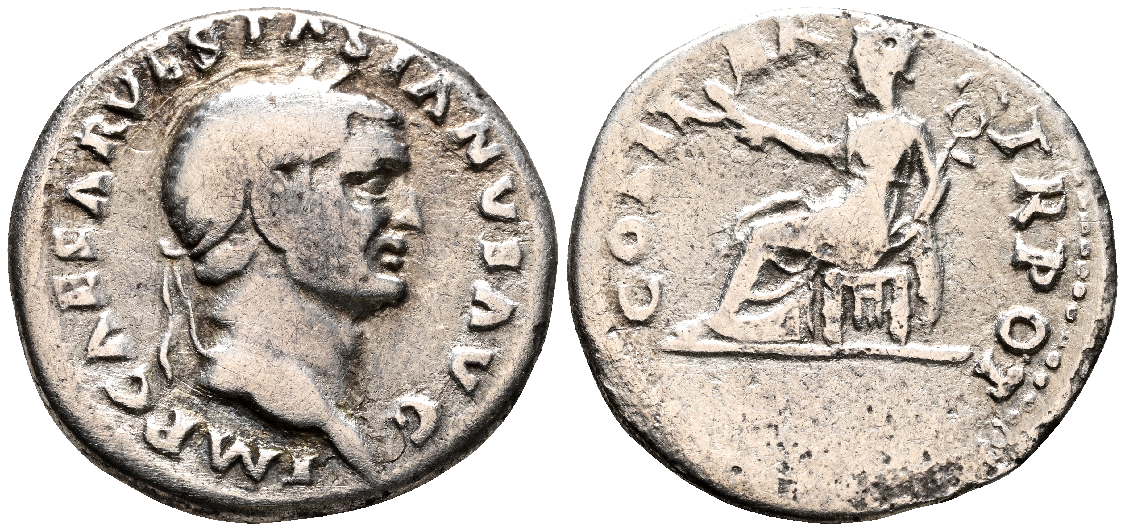 VESPASIANO. Denario. (Ar. 2,97g/18mm). 69-79 d.C. Roma. (RIC 29). Anv: Cabeza laureada de Vespasiano a derecha, alrededor leyenda: IMP CAESAR VESPASIANVS AVG. Rev: Pax sedente a izquierda portando rama y caduceo, alrededor leyenda: COSITER TR POT. MBC-.