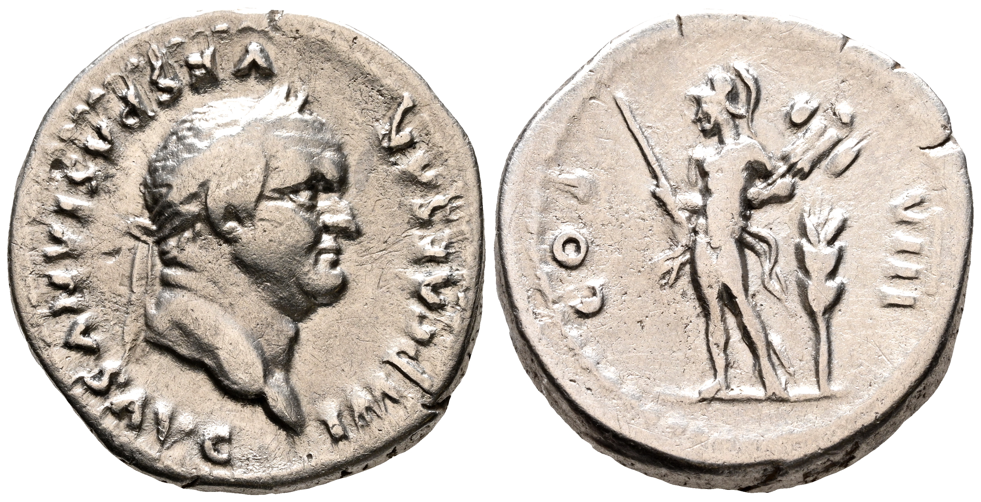 VESPASIANO. Denario. (Ar. 3,05g/18mm). 77-78 d.C. Roma. (RIC 937). Anv: Cabeza laureada de Vespasiano a derecha, alrededor leyenda: IMP CAESAR VESPASIANVS AVG. Rev: Marte estante a izquierda portando cetro y trofeo, detras espiga, alrededor leyenda: COS VIII. MBC+.