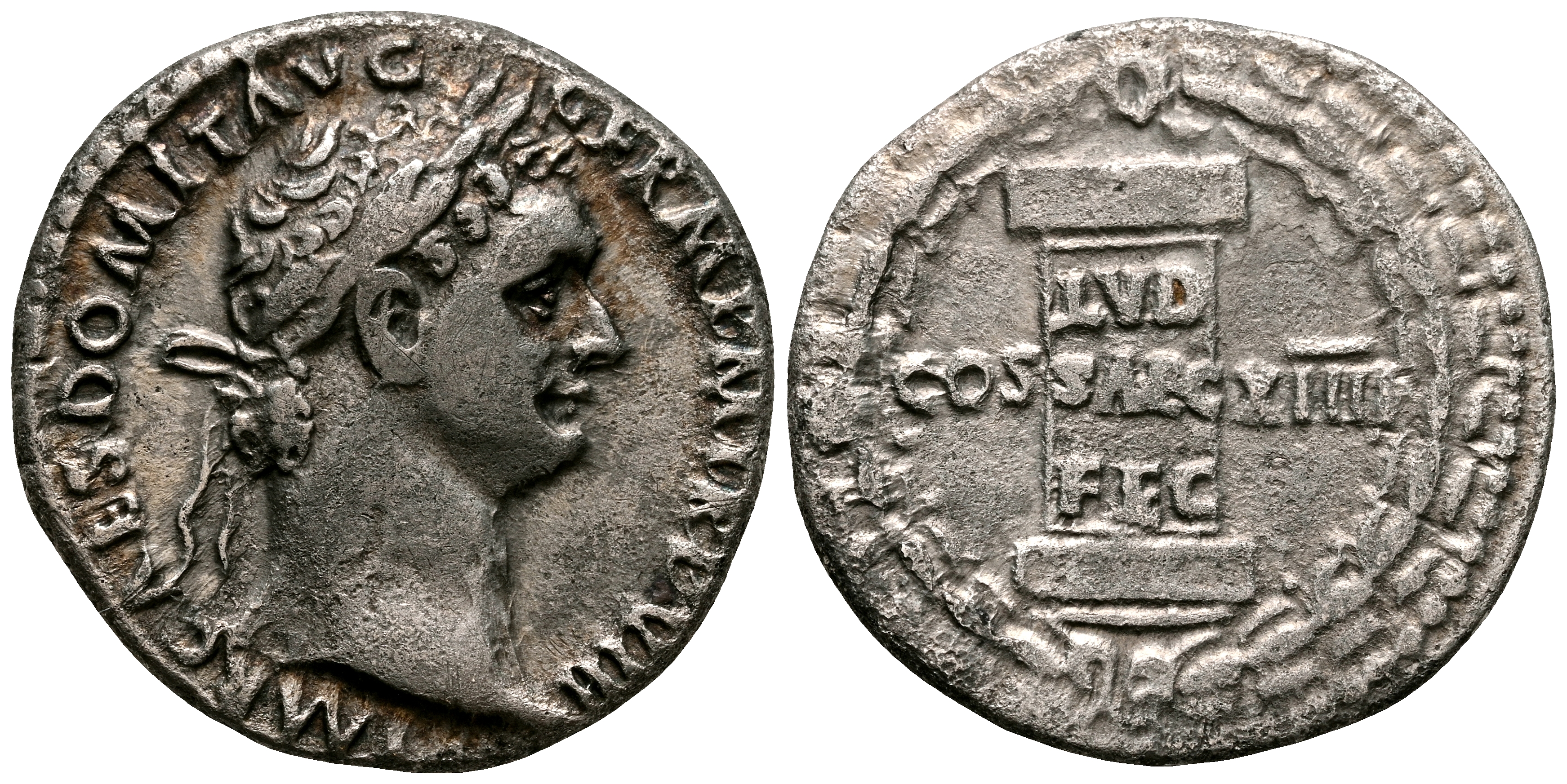 DOMICIANO. Denario. (Ar. 3,22g/18mm). 88 d.C. Roma. (RIC 604). Anv: Cabeza laureado de Domiciano a derecha, alrededor leyenda: IMP CAES DOMIT AVG GERM P M TR P VIII. Rev: Columna con inscripción: LVD/SAEC/FEC, entre: COS XIIII, todo dentro de corona de laurel. MBC. Escaso ejemplar.