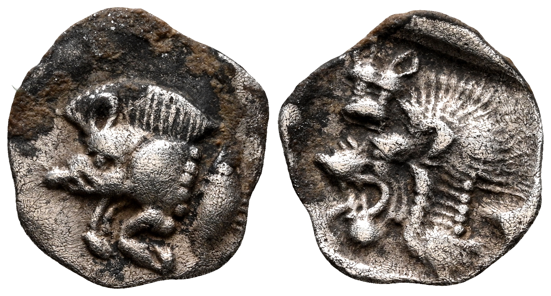 MISIA, Cíco. Obolo. (Ar. 0,30g/9mm). 450-400 a.C. (SNG France 5386). Anv: Parte delantera de Jabalí a izquierda, detrás atún. Rev: Cabeza de león a izquierda dentro de cuadrado incuso, en campo cabeza de lobo de frente. MBC.
