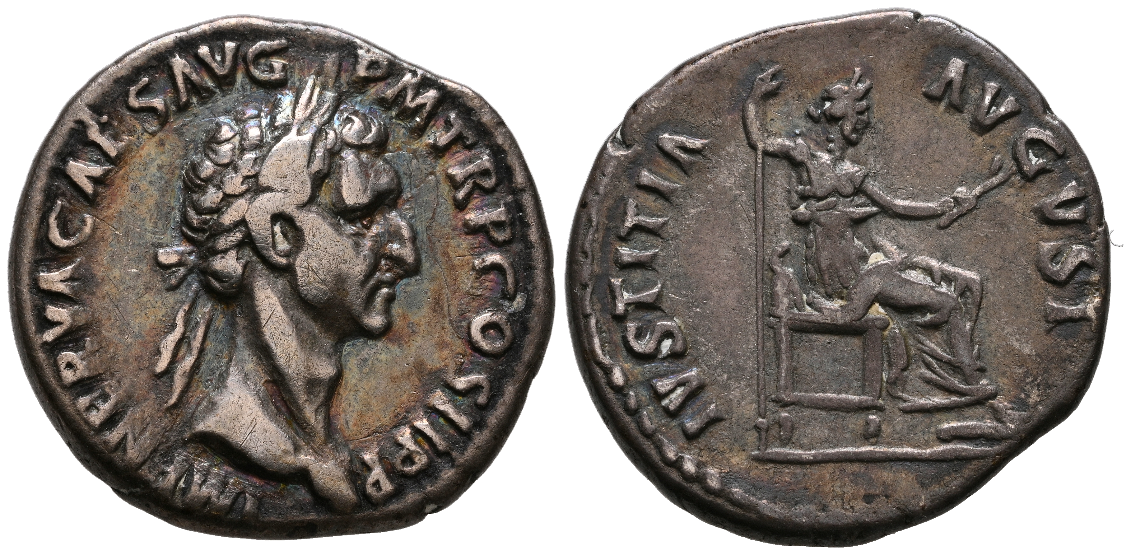 NERVA. Denario. (Ar. 3,28g/18mm). 97 a.C. Roma. (RIC 18). Anv: Cabeza laureada de Nerva a derecha, alrededor leyenda: IMP NERVA CAES AVG P M TR P COS II P P. Rev: Justitia sentada a derecha portando rama y cetro, alrededor leyenda: IVSTITIA AVGVST. MBC. Bonito ejemplar con un atractivo tono irisado, escaso así.