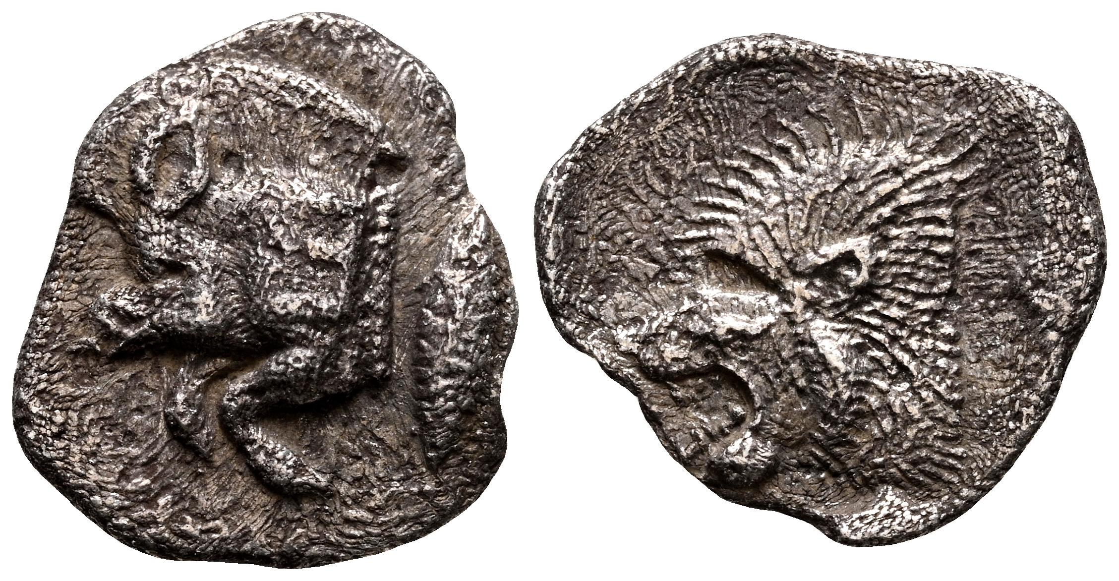 MISIA, Cícico. Óbolo. (Ar. 0,78g/12mm). 450-400 a.C. (SNG France 5386). Anv: Parte delantera de Jabalí a izquierda, detrás atún. Rev: Cabeza de león a izquierda dentro de cuadrado incuso, en campo cabeza de lobo de frente. MBC.