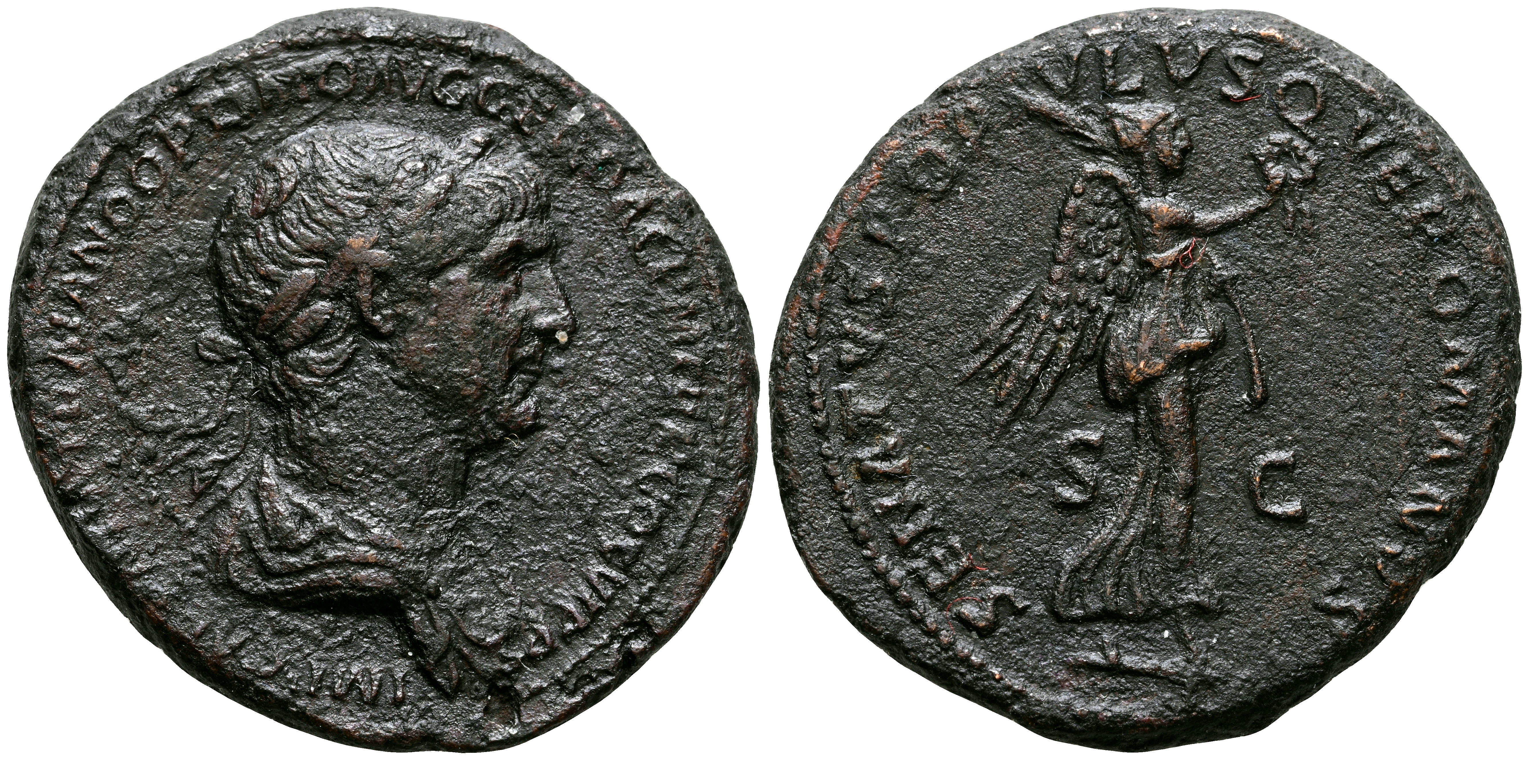 TRAJANO. As. (Ae. 11,75g/28mm). 114-116 d.C. (RIC 675). Anv: Busto laureado de Trajano a derecha, alrededor leyenda: IMP CAES NER TRAIANO OPTIMO PROMEDIO DAC P M TR P COS VI P P. Rev: Victoria a derecha portando palma y corona de laurel, entre: S-C, alrededor leyenda: SENATVS POPVLVSQVE ROMANVS S C. MBC-.