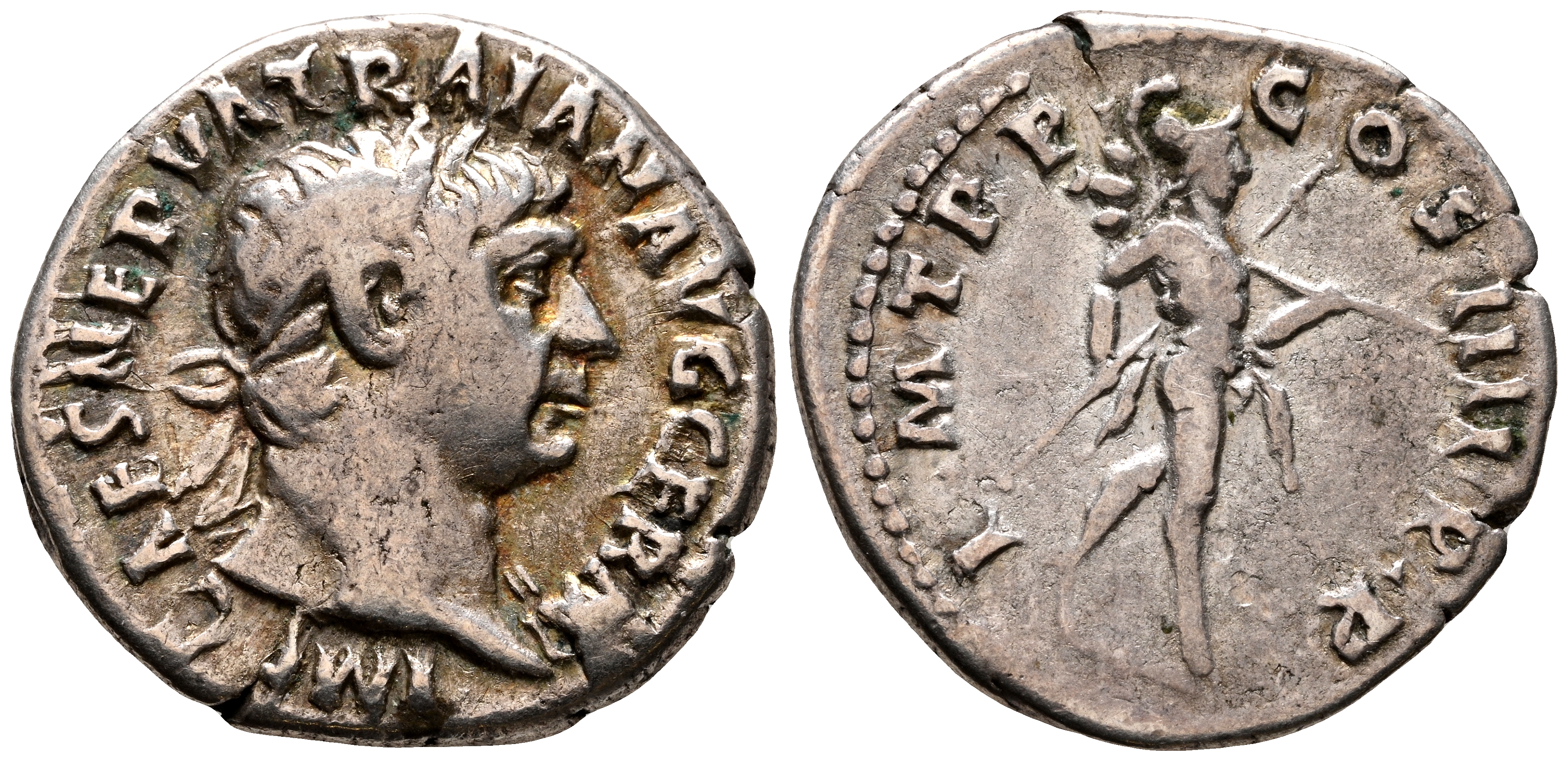 TRAJANO. Denario. (Ar. 3,18g/19mm). 101-102 d.C. Roma. (RIC 52). Anv: Busto laureado y drapeado de Tranajo a derecha, alrededor leyenda: IMP CAES NERVA TRAIAN AVG GERM. Rev: Marte avanzando a derecha, portando cetro y lanza, alrededor leyenda: P M T R P COS IIII P P. MBC.
