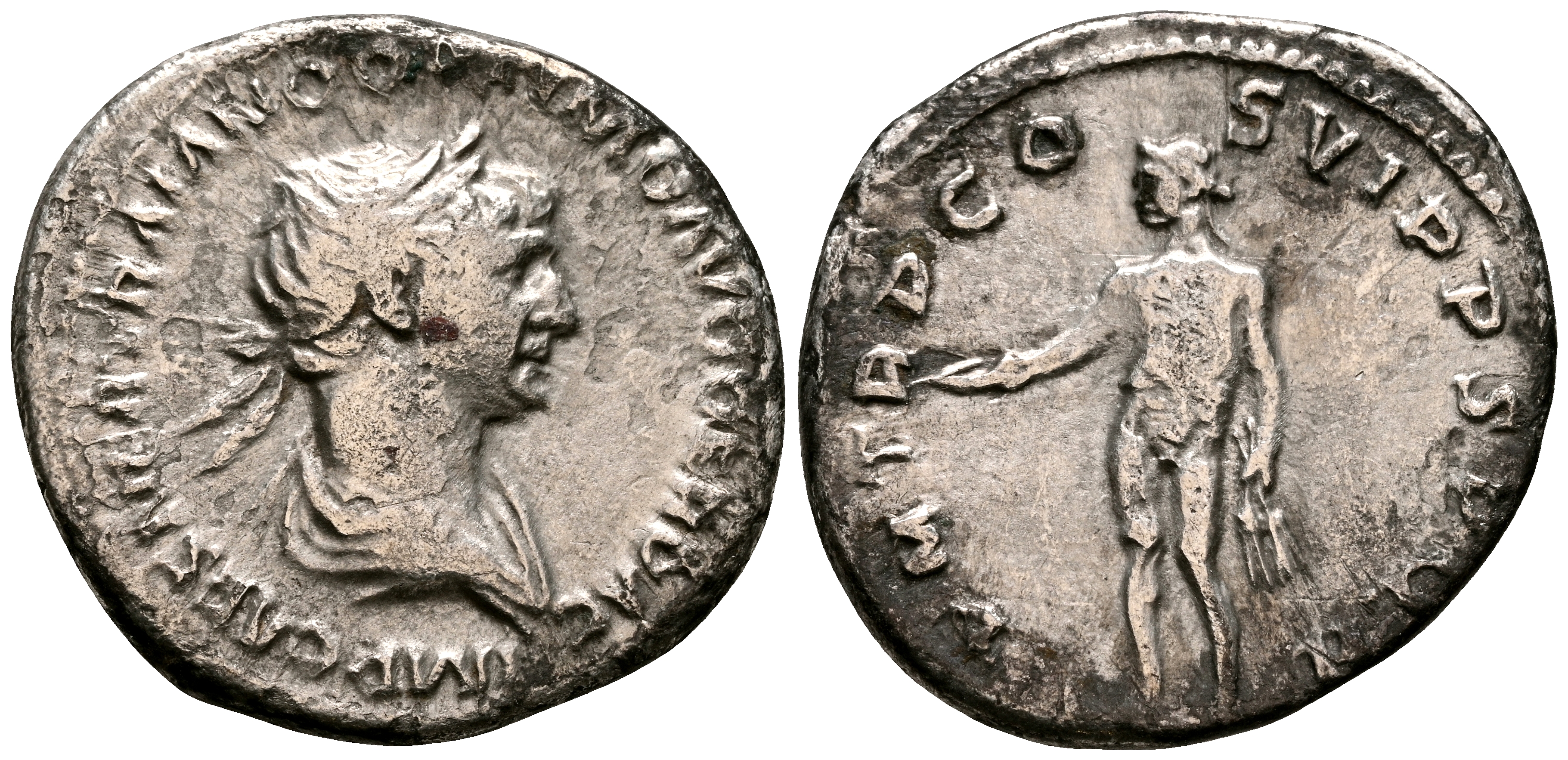 TRAJANO. Denario. (Ar. 3,14g/19mm). 114-116 d.C. Roma. (RIC 347). Anv: Busto laureado y drapeado de Trajano a derecha, alrededor leyenda: IMP CAES NER TRAIANO OPTIMO AVG GER DAC. Rev: Genio estante a izquierda portando pátera, alrededor leyenda: P M TR P COS VI P P SPQR. MBC-.