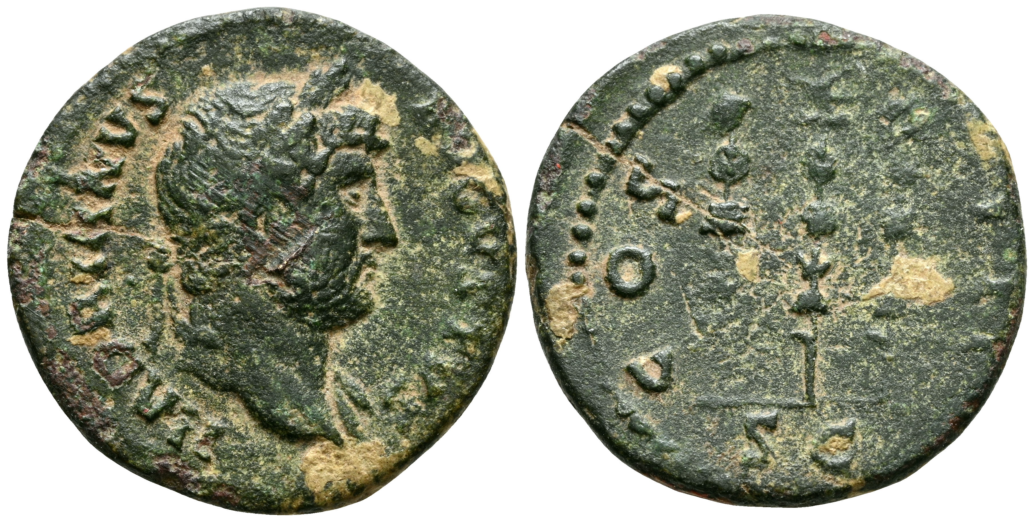 ADRIANO. Cuadrante. (Ae. 2,90g/17mm). 125-128 d.C. Roma. (RIC 689). Anv: Cabeza laureada de Adriano a derecha, alrededor leyenda: HADRIANVS AVGVSTVS. Rev: Águila imperial sobre tres estandartes, en exergo: SC, alrededor leyenda: COS III. MBC.